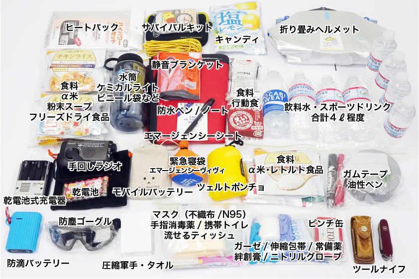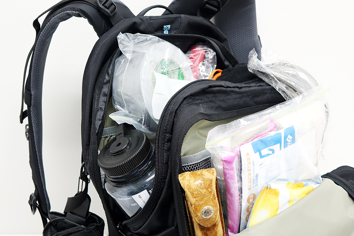 こちらはおおよその目安となるアイテム。これらを収納するために25ℓ程度の容量のデイバッグ(バックパック)を準備する。人によっては、このバッグが今後の避難生活のコアとなる場合があるので、アイテム選びは慎重に行いたい。