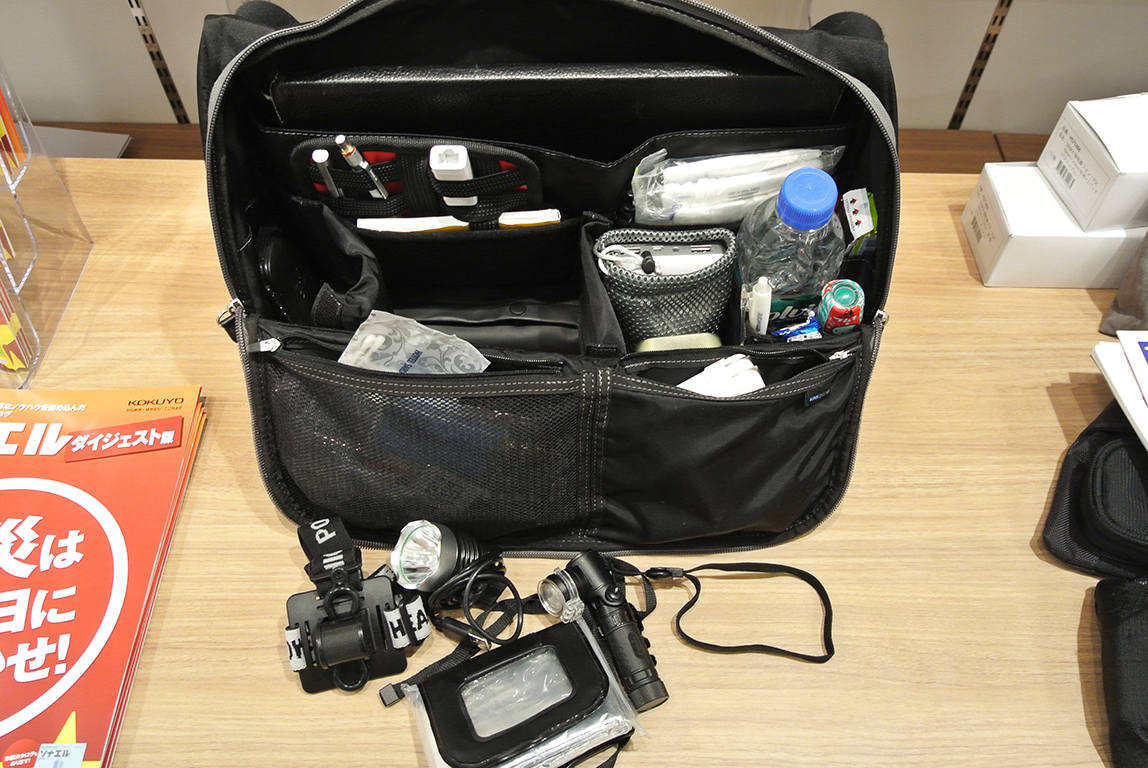 活用例としては、災害時初日を職場などで一晩篭城する。その際、会社などに備蓄されている水食料などがあればそれらの配給を受け、それらすべての装備を総合的に活用する。バッグにはレトルト食品なども装備してあるので、初日夜などはヒートパックを使用して暖かい食事を摂るなどしよう。
