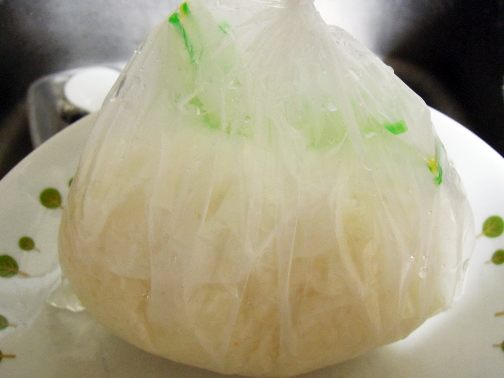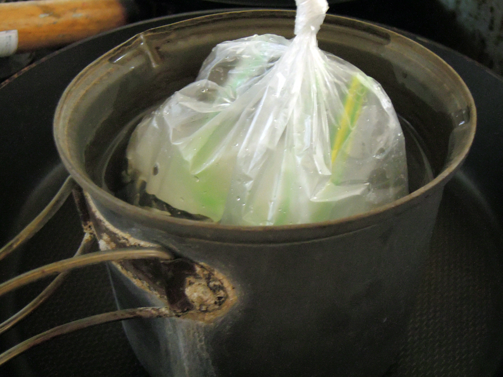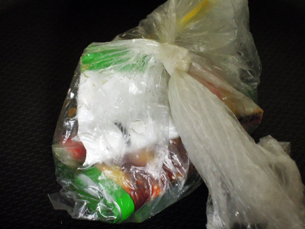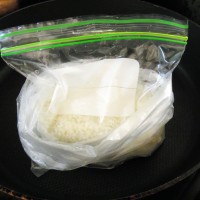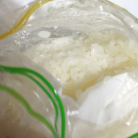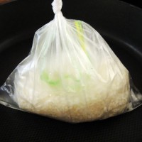 今回は、2種類のビニール袋を利用しているが、同じ種類のビニール袋でももちろん問題ない。今回使用したのは内袋に100円ショップで買ったチャック付きのストックバッグ(冷凍保存用)と、外袋にポリエチレン製の普通のストックバッグ(ビニール袋)。内袋にチャック付きのストックバッグを使用したのは、一合づつ小分けにして保存、準備しておける事と、メモ欄に調理方法などをメモしておくことができるから。