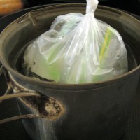完成。熱くなっているので、袋を開けるには注意が必要。固く結んでいるとほどくのに苦労する。内袋をチャック付きストックバッグ(冷凍用)にしたので、他の袋を使用するよりも若干しっかりした感じに。非常時はこのまま食器代わりにして直接食べると汚れ物が出なくて良いだろう。食品と茹でるお湯は直接触れる訳ではないので、飲料水の確保が容易ではない場合には、飲用に適さない水を煮炊き用に使用する事も出来る。