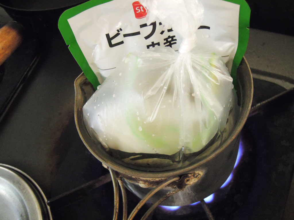 温める際、火は強すぎないよう調整した方が良い。イメージとしてはクッカーの底に火が当たる程度で、側面まで火が回るような火力だとビニール袋が溶けてしまう恐れがある。季節や好みの固さなど諸要件で時間は変わるが、おおよそ15分〜20分程度茹でると完成。柔らかく仕上げたい場合には水を多めに入れるなど、あらかじめ試しておくと良いだろう。