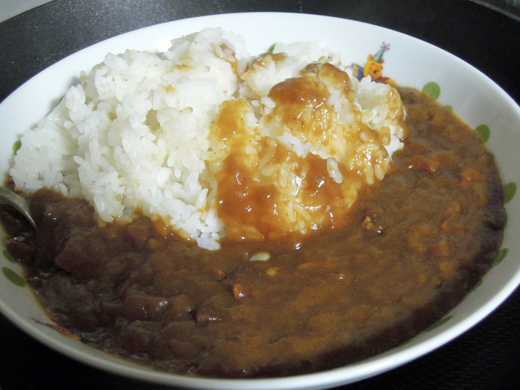 盛りつけ例。今回は、普通のお皿に盛りつけたが、非常時の場合はクッカーや食器にビニール袋を被せ(外袋が破れてなければそれを使用するとなお良い)、その上にに盛りつければ食器を洗う必要が無い。今回、1合の米に200gのレトルトカレーを使用したが、女性であれば二人でわけても良いくらいの分量だろう。その場合、半分はビニール袋を被せた食器に盛りつけ、半分は先ほどの調理用の袋にカレーをかける、もしくはレトルト食品の袋にご飯を入れるパターンにする。今回はカレーを選択したが、缶詰を温めておかずにしたり、ふりかけなどを使用しても良い。特に、通常のお米を研がずに調理した場合には、ふりかけなどの匂いや味が強いおかず、添加食品を併用する事で気にならなくなる効果も得られる。
