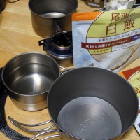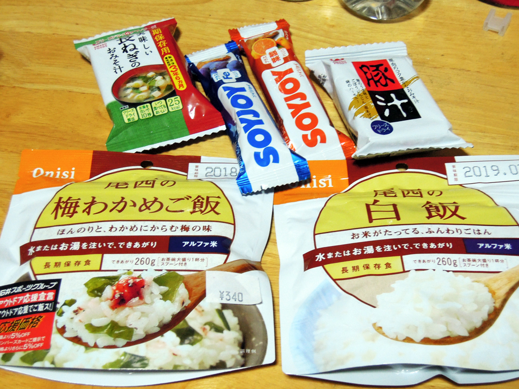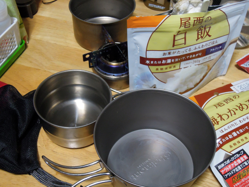 脱出時のメニューは、避難生活の場合と異なり、可搬性、収納性を重視する。極論では、白飯(アルファ化米)+フリーズドライのスープを2セット、カロリーメイトなどのエナジーバーのセットを1日分としてそれを3〜4セット(3〜4日分)用意して、その調理に必要な食器、調理器具、燃料を最小限の構成で準備するので十分だ。