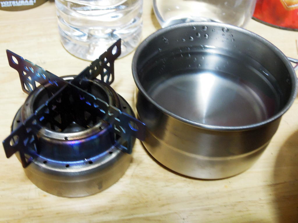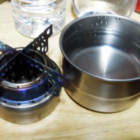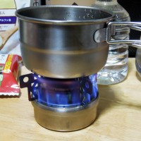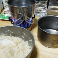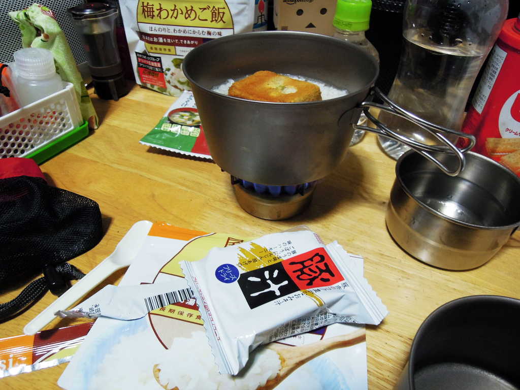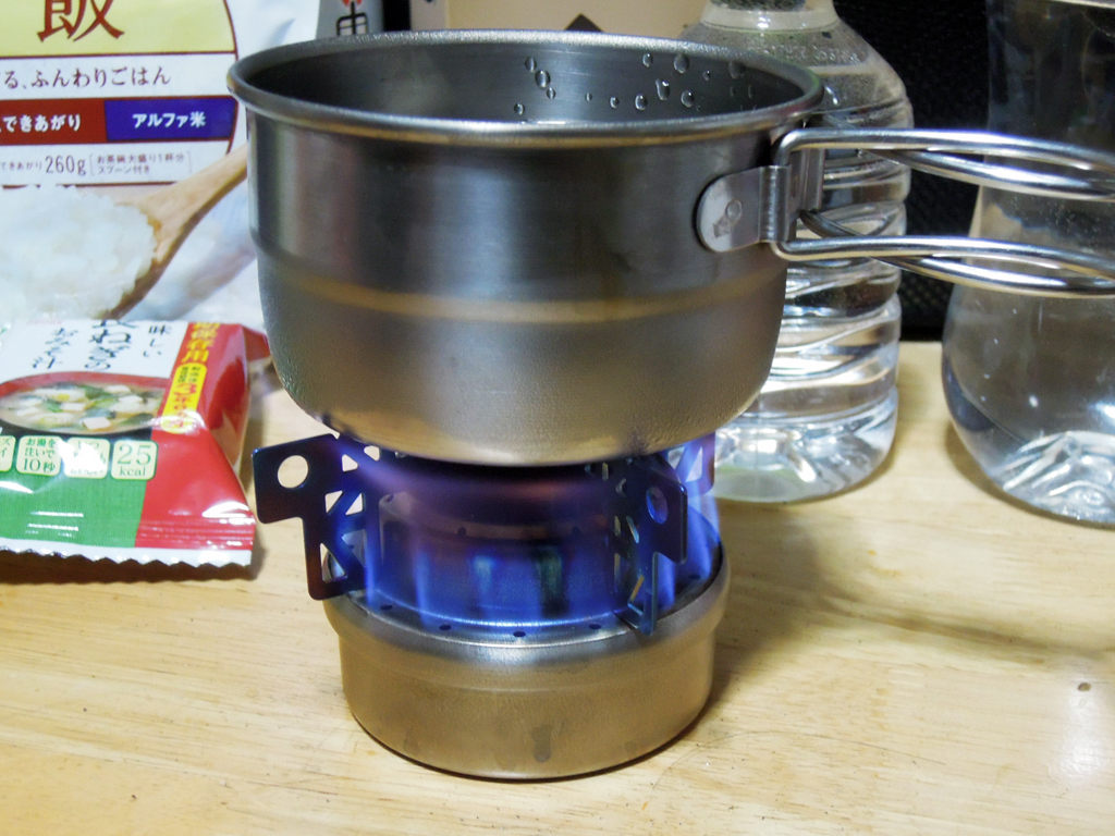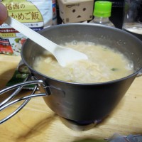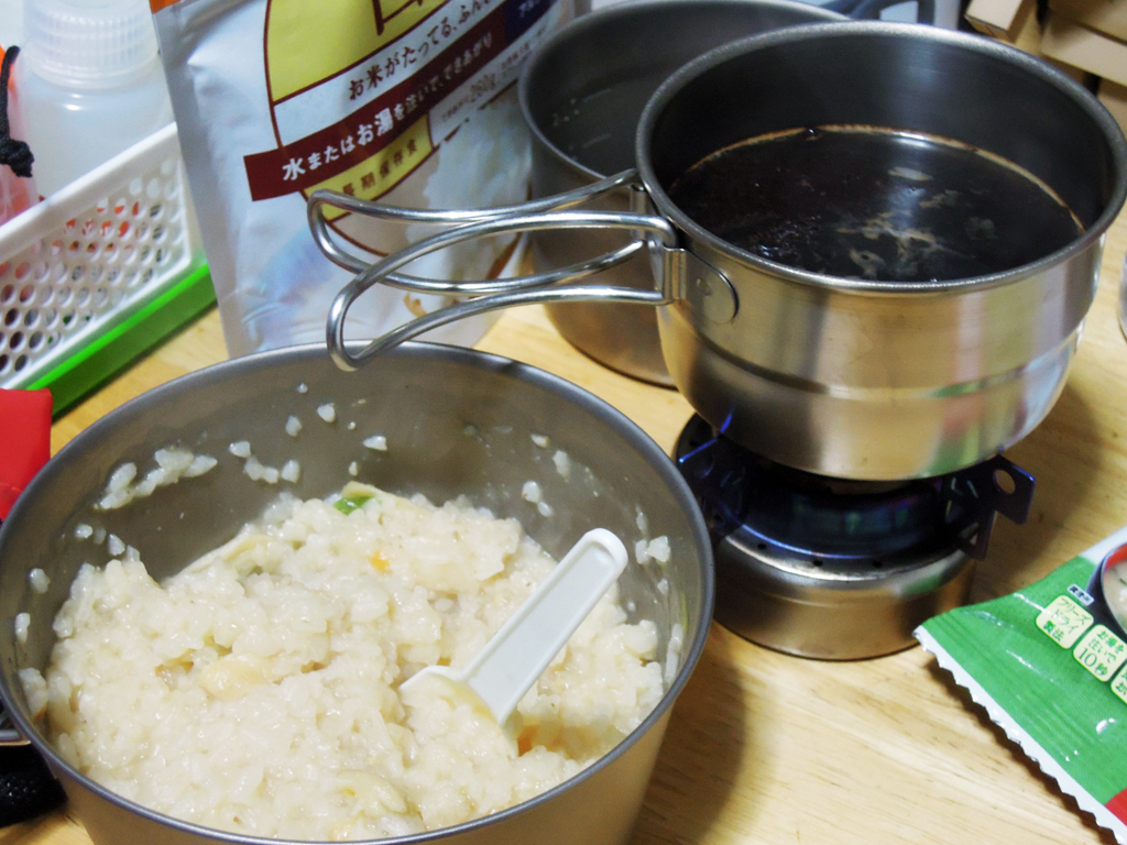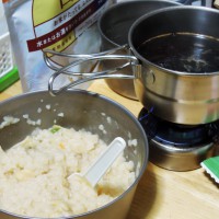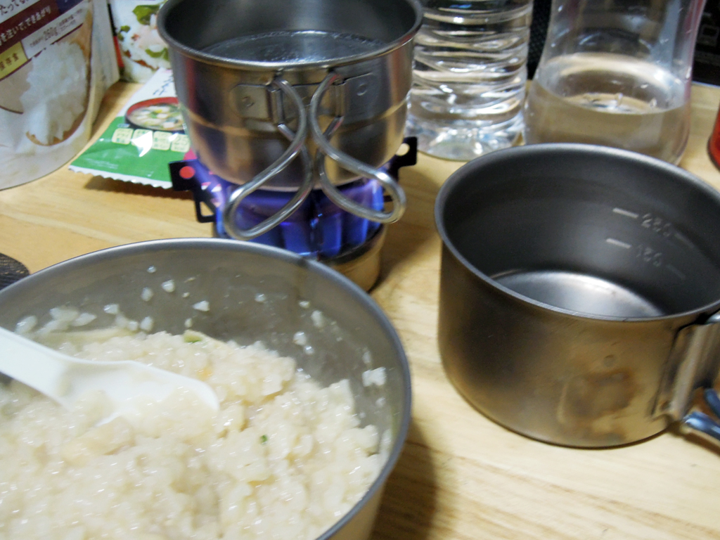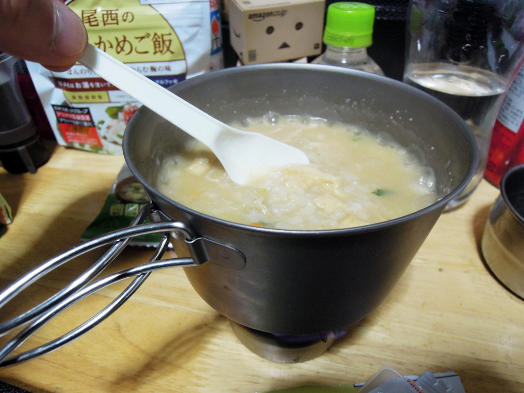 使用したアルコール燃料は30ml。グツグツ煮えるまでかき混ぜる。白飯とスープを一緒に、雑炊っぽく調理するのは、食器の洗浄を簡略化するため。煮立ったところで火から下ろして別のカップでお湯を沸かす。そのお湯でコーヒー、お茶などを入れて雑炊を食べたカップを濯ぎつつ飲む。