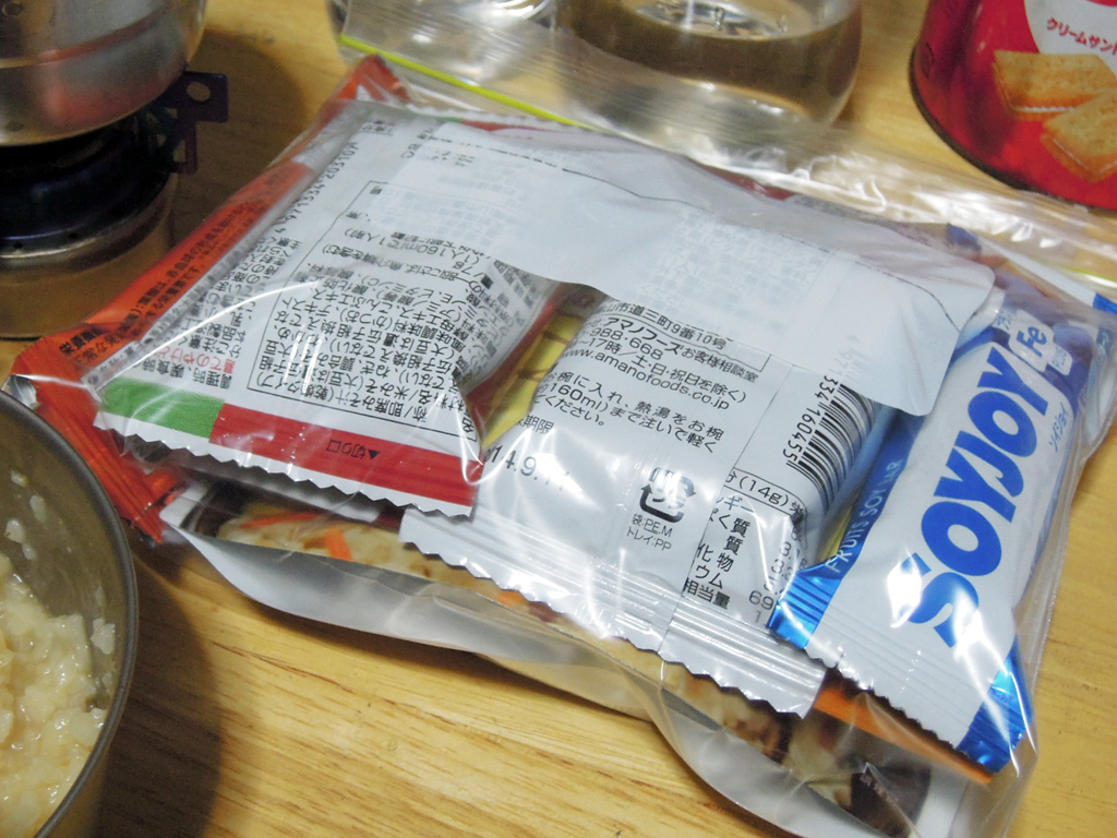 1日分の食料は、ジップ付きのプラスチックバッグに小分けにしてまとめておくと良い。利用の仕方としては、夕飯(就寝)→朝食(大部分のゴミを処理。行動食をポケットなどに入れ活動開始)→昼食、のローテーションで使用するのが効率的だ。