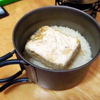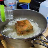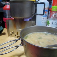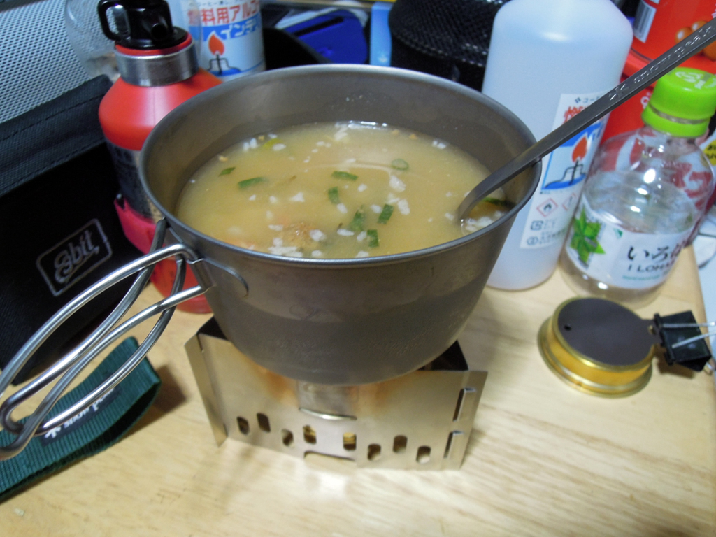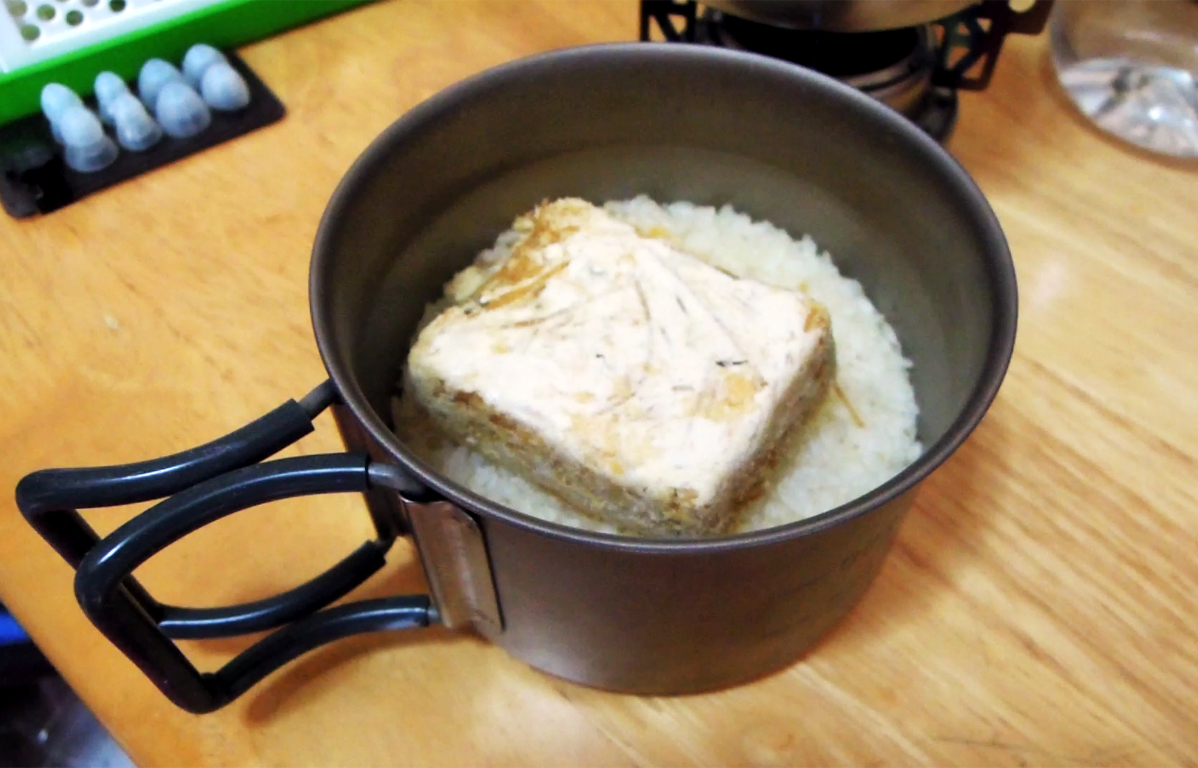 アルファ化米とフリーズドライのかに汁を使って雑炊を作る様子。機材は最小限のチタン製アルコールストーブ、チタンカップ