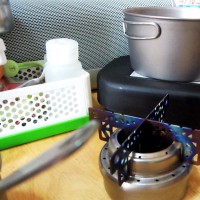 アウトドア(ウルトラライトのキャンプ、縦走)などでは、軽量化を重視して最小限の装備で、非常用は万一のバックアップも考慮して軽量化、コンパクト化を行いつつ冗長性も持たせておく。最小限の構成は、チタンアルコールストーブ、チタンカップ(400cc)、チタンカップ(280cc)、十字形のゴトクのみ。