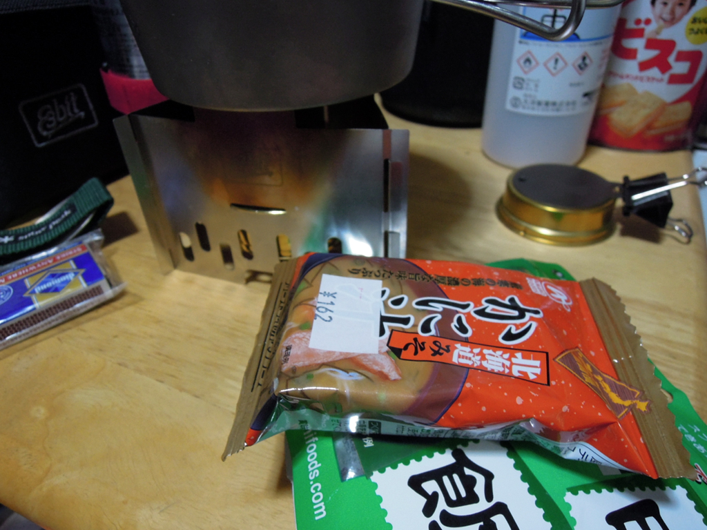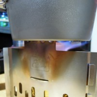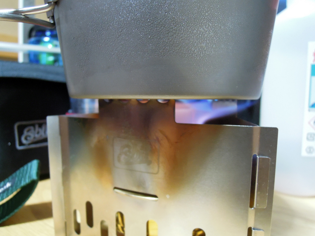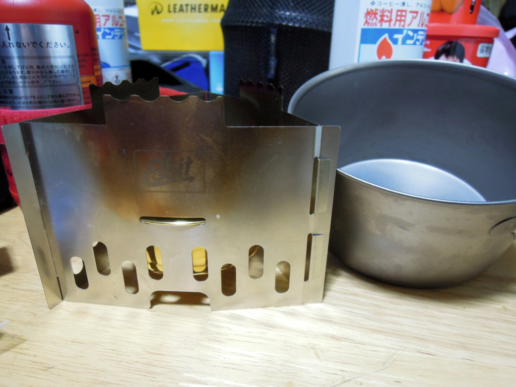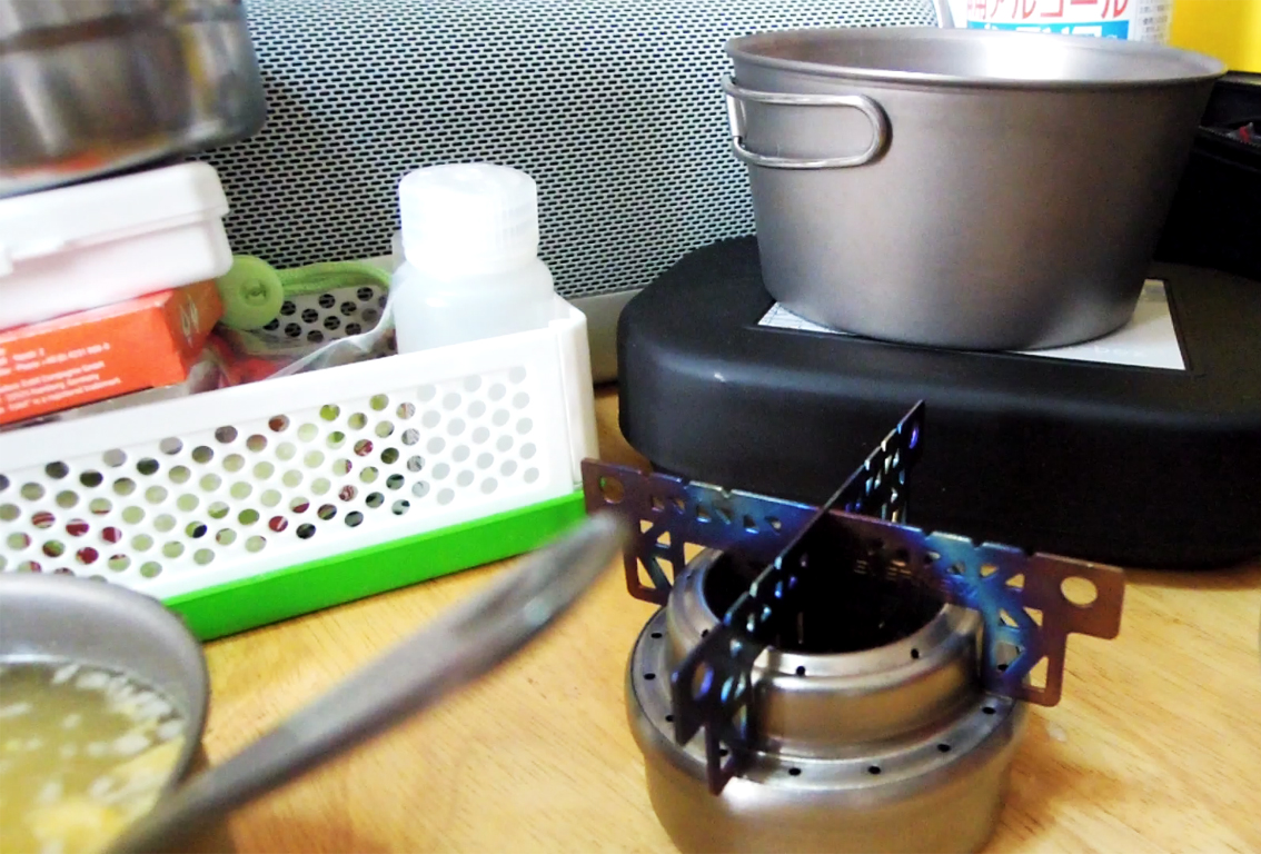 さすがに400ccのカップではギリギリだったので、600ccのチタンカップで再度チャレンジ。今度は冗長性を持たせた構成(トランギアのアルコールストーブにエスビットのゴトクを使用。エスビットのゴトクは本来固形燃料用のトレイを付けて使用するもので、トランギアのアルコールストーブを代わりに付ける事が可能なもの)