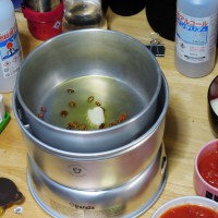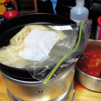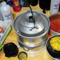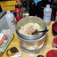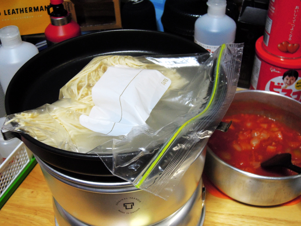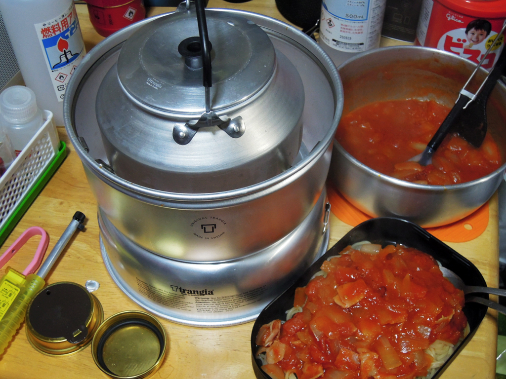 トランギア ストームクッカーは、アルコールストーブを使用した本格的なクッカーだ。収納時はコンパクトにまとまるが、使用する時には、本格的なカマドとして各種料理が出来る。今回は、震災などでガスが止まってしまった際、自宅に備蓄されていた材料を使用してトマトソースパスタを作るという設定で、料理をしてみた。