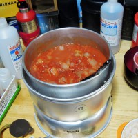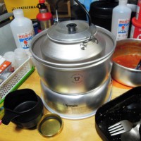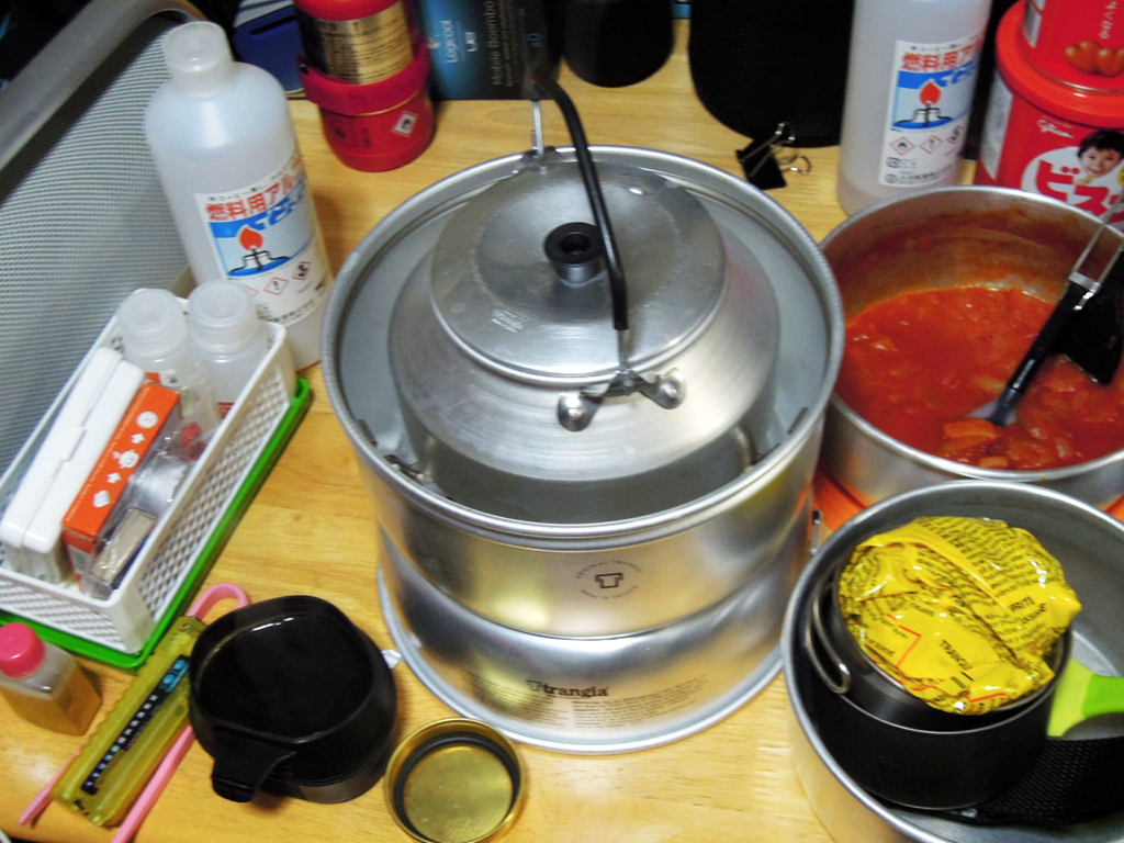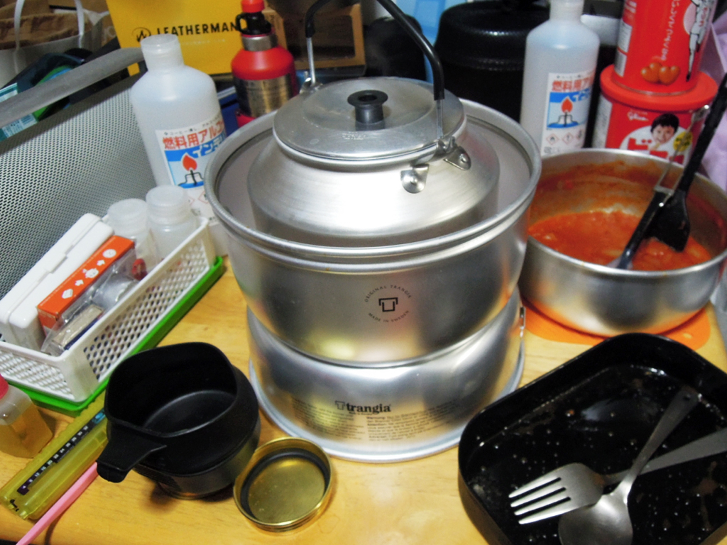 ソースパン(鍋)をおろしたタイミングでヤカンを火にかける。食べている間にお湯が沸くので、沸いたらコーヒーやお茶などを入れれば完璧だ。今回使用した燃料は、ほぼ満タンで最後のお湯まで沸かすことができた。アルコールストーブは、最大火力などはガスやガソリン、灯油などのストーブより弱いがそれでも火力は十分で、ストームクッカーのように熱効率を良くする風防があることで、燃料効率は最大化する。キャンプでも本格的な料理に使用できるのと、非常時であっても少ない燃料で効率よく料理が出来る(音も静か)ので、キャンプ用のクッカー、ストーブを選ぶ際には、非常時での使用も想定して、選んでみるのも良いだろう。