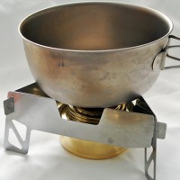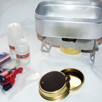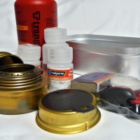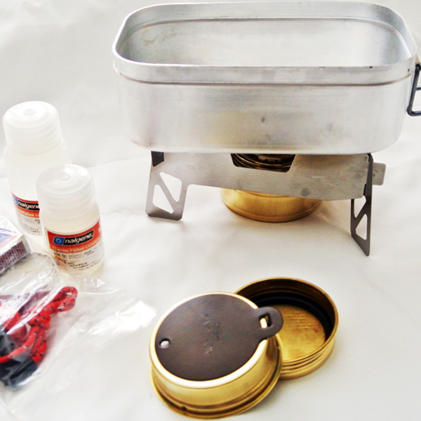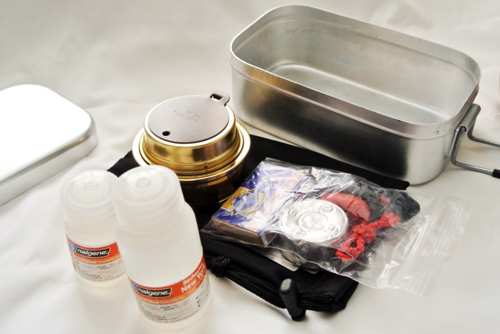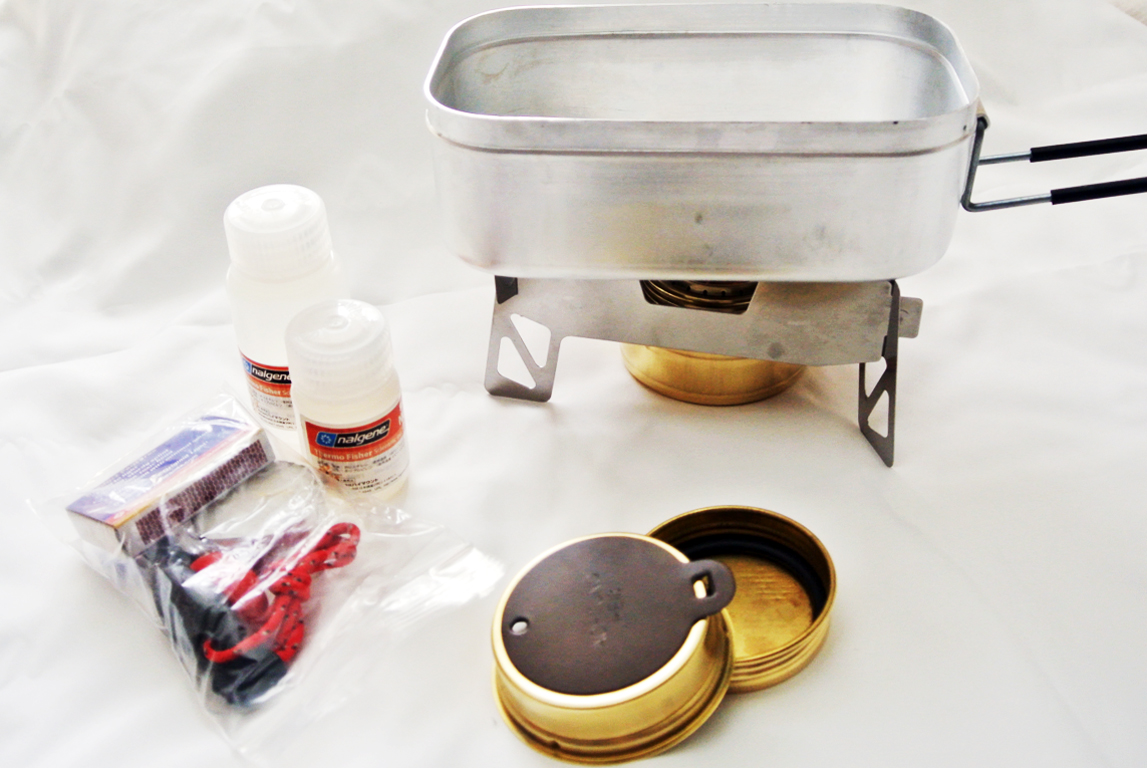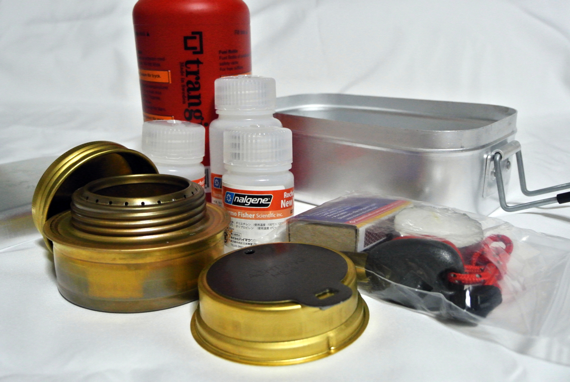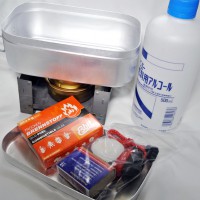 最もコンパクトなセットとしては、アルコールバーナー、トライアングルグリッド(鍋等を載せるゴトク)、燃料ボトル(60cc/30cc)、マッチ・ライターなどの着火用具などがメスティンに収納可能。このセットで、主な調理(飯盒炊爨および煮炊き)が行える。