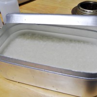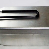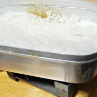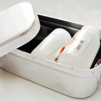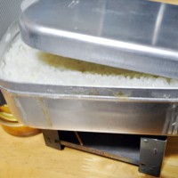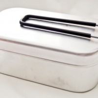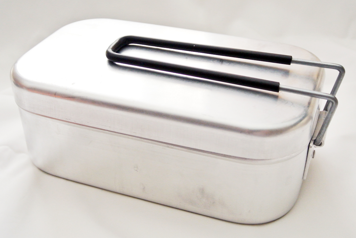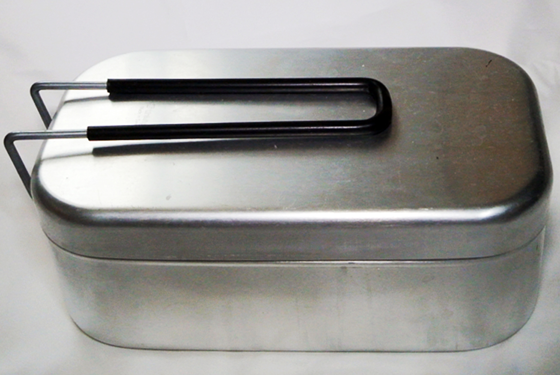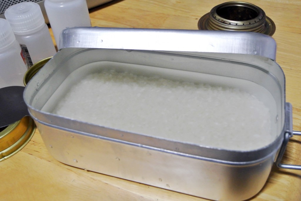 」は、基本的にはこれら携行品を収納する容器として、また、お湯を沸かすための器(鍋)として使用するが、アルミ製で熱伝導率も良く、容量も適当なため、これで米を炊く事も可能。計量しやすいのと失敗しにくいので、1合炊くのがおススメ。キャンプ等の場合、無洗米を使用して水を200cc(上蓋すり切りで約200cc)入れて30分浸し、火にかける。