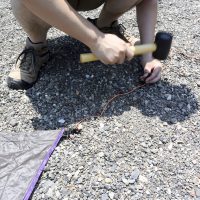 ペグが打てない硬い地面であっても、大きな石など重りになるものをガイライン(細引き)に結んで固定するなどは、テントの場合と変わらない。木の枝や、柱などがあればそれを利用するのも良いだろう。