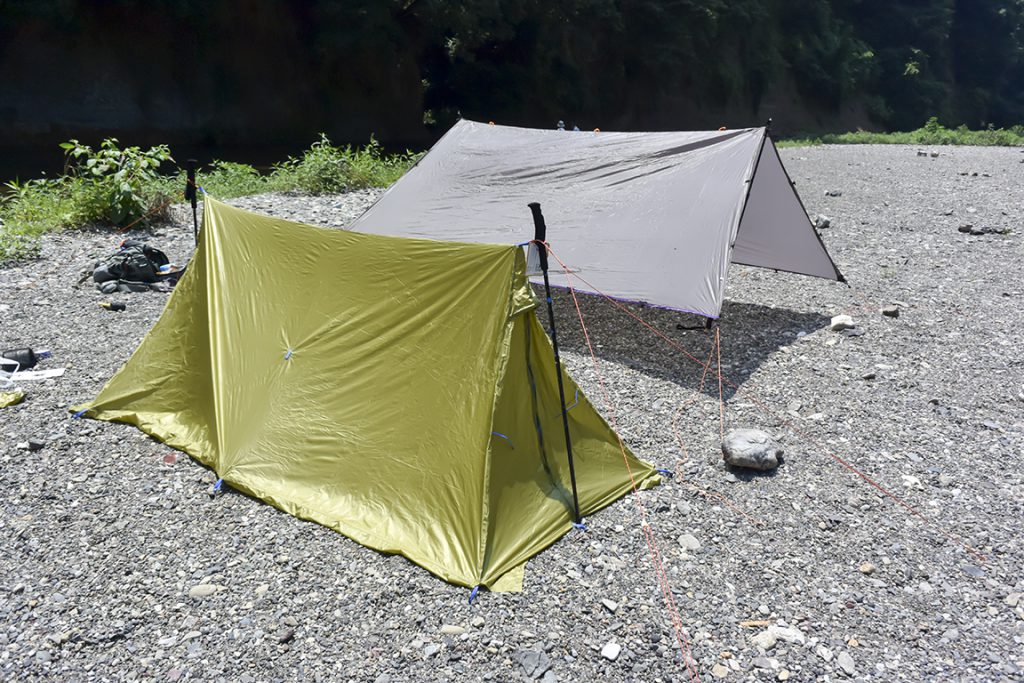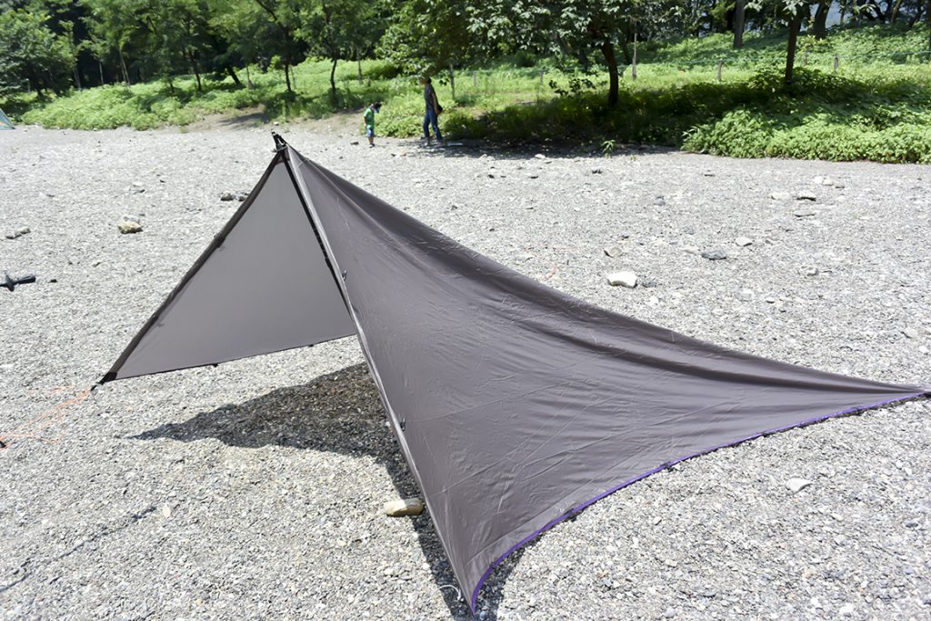 PaaGo WORKSの「ニンジャタープ」は、その形状と多数のジョイントポイントによって30以上の形状に設営できるマルチなタープ。重量も500gと軽量なのがよい。トレッキングポールを使用してツェルトのように使用することや、フロアレスシェルターとして使うことも可能だ。