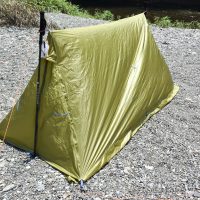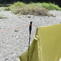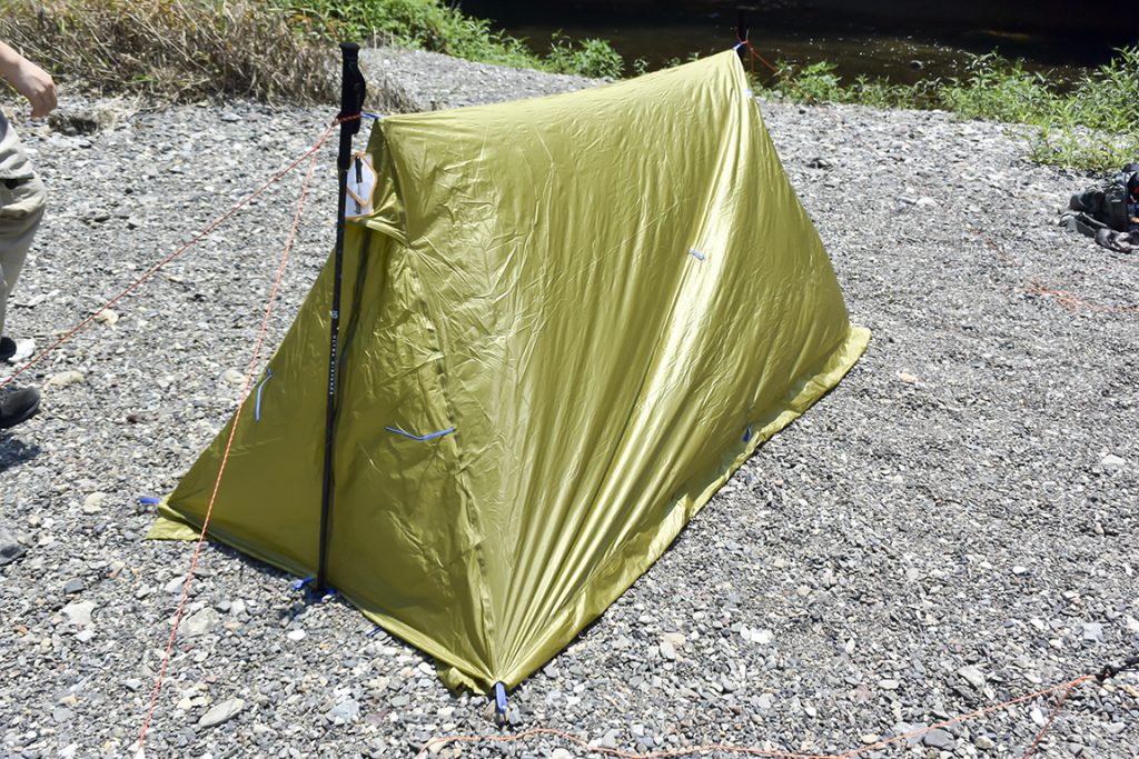 ツェルトは、登山などでも非常用のシェルターとして携行が奨励されているとおり、簡易テントとして使うにも十分な機能を持っている。大きく広げてタープのように使うことももちろん可能だ。ファイントラックの「ツエルト2ロング」は、340gと軽量ながら、設営時の奥行きが220cmと大人が横になり、足元に荷物を置いても余裕があるサイズなので、テント泊の際に積極利用されることもあるモデルだ。
