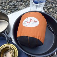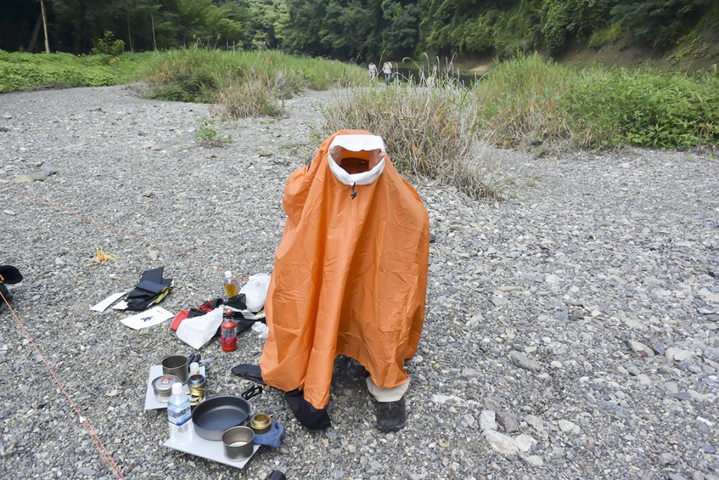 ジュウザの「エム・シェルター」は、箱状に縫製されており被るだけでシェルターの形状を保持することが可能。最大2名が休むことができるサイズなので、雨避け、寒さよけだけでなく、着替えや、携帯トイレを使用する際の簡易な目隠しとしても使うことができるだろう。