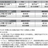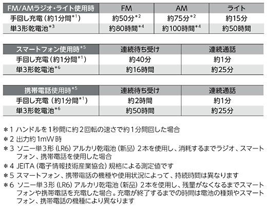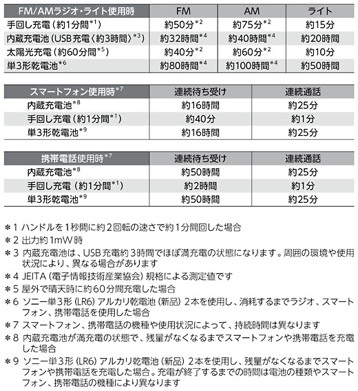 FM/AMラジオ、ライト、スマートフォン、携帯電話使用時の電池持続時間