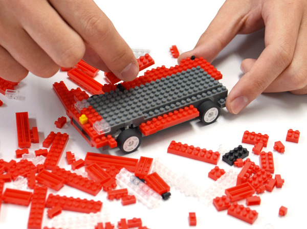 ブロックを取り付ける事が出来る突起が付いているRC本体(土台)に、組み立て説明書を見ながら付属のブロックを取り付けていくだけで格好いいRCカーが出来上がります。