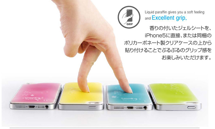 香りの付いたジェルシートを、iPhone5に直接、または同梱のポリカーボネート製ケースの上から貼り付けることでぷるぷるのグリップ感をお楽 しみいただけます。