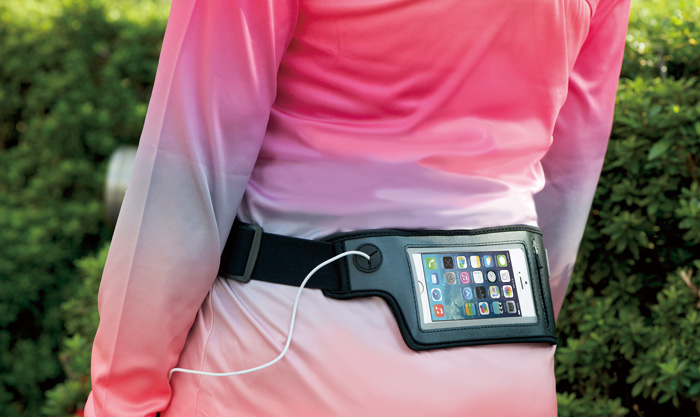 JOGPOCKET for iPhone v2は、伸縮性のあるバンドを採用しているので、ウエストに着けて使ったり、たすき掛けで使ったり、いろいろな装着方法で使用することができます。