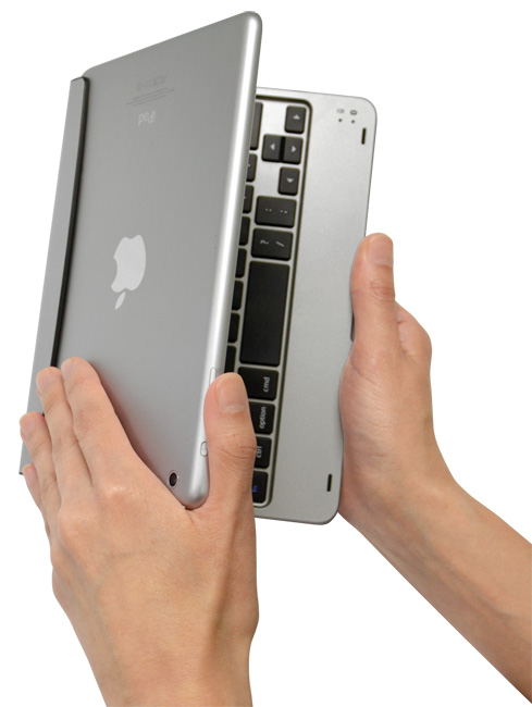 「iPad mini 用 ワイヤレス キーボード BooKey Pro」は「iPad mini」を取り付けた状態でノートパソコンと同じようにフタを閉じて、たたむ事が出来るキーボードです。