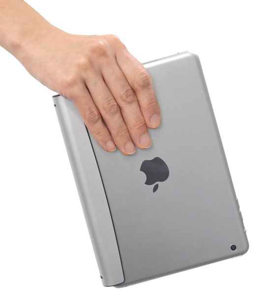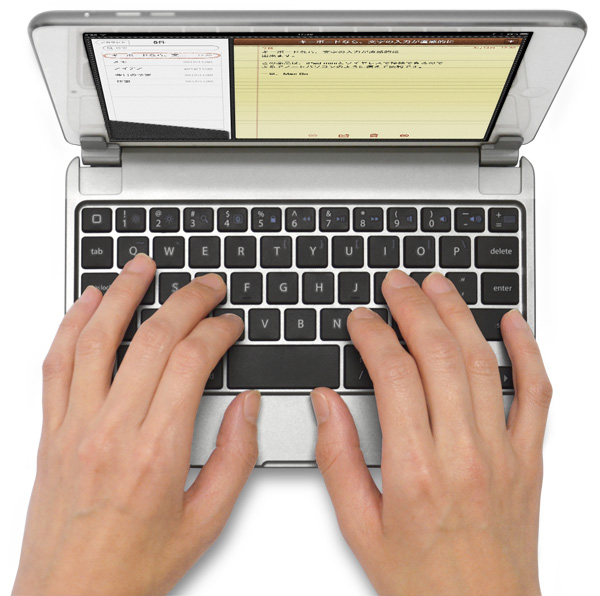 キーボードの後側にあるスタンドに「iPad mini」をはめ込み固定することで「iPad mini」がノートパソコンの様な形状に早変わり。まるでノートパソコンを使っている様な感覚で「iPad mini」で文字の入力をする事が出来ます。