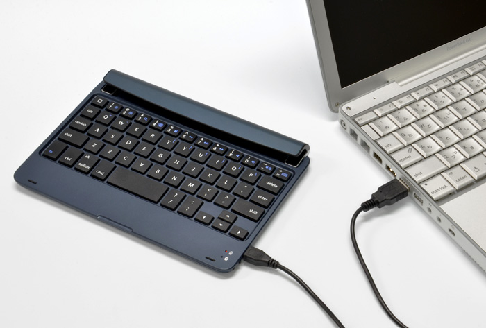 「iPad mini 用 ワイヤレス キーボード BooKey Pro」は、付属のUSB充電ケーブルを使ってパソコンのUSB端子と接続することで、内部の「リチウムイオンポリマーバッテリー」を充電する事が出来る、USB充電対応のワイヤレスキーボードです。