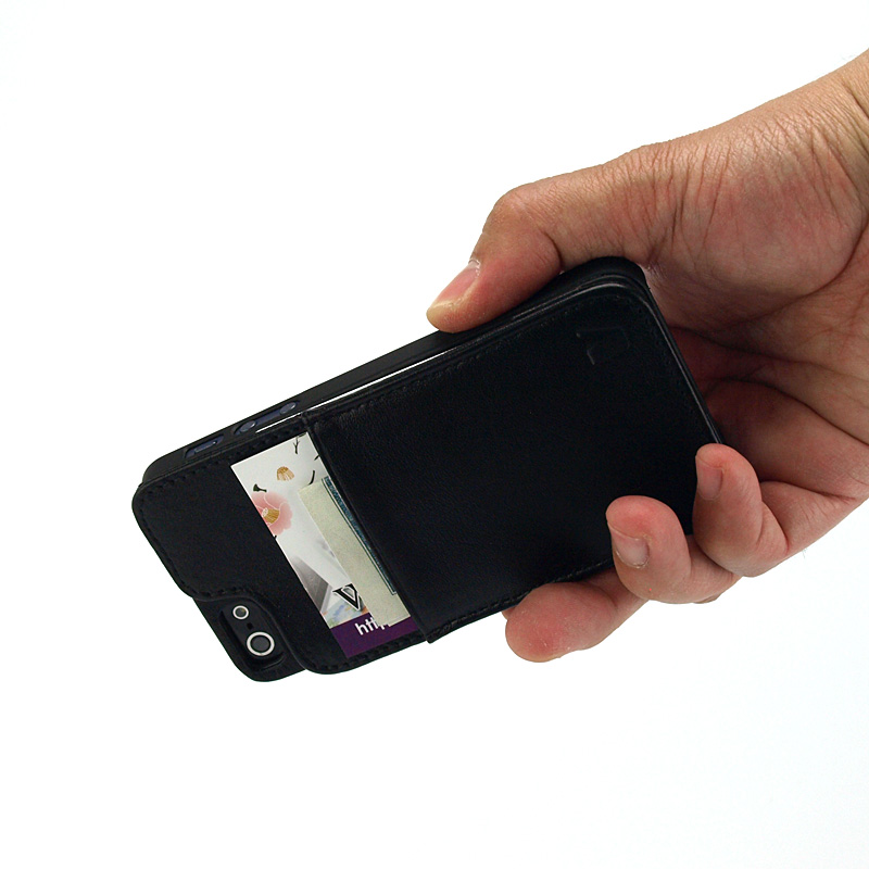 背面にはカード類を最大8枚※1収納できる本革製ホルダーを搭載。抜群のカード収納力なので名刺、各種ポイントカードや免許、保険証なども身軽に持ち運べます。ホルダー外部にはポケットも装備しており、現金や鍵などをセットすればiPhoneひとつで外出も可能。本革製なので柔らかな質感が心地よいホールド感を生みます。