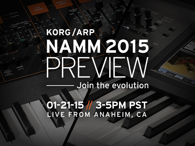 2015 年 1 月 22 日から USA/アナハイムにて開催される世界最大の楽器の祭典「The NAMM Show 2015」。 その開催前日である 1 月 21 日午後(*日本時間で 1 月 22 日朝)、コルグでは「KORG/ARP NAMM 2015 PREVIEW ‒ Join the evolution」と題し、今冬の新製品をフィーチャーした発表会を実施。その模様を KORG USA の YouTube チャンネルより全世界へ生配信致します。