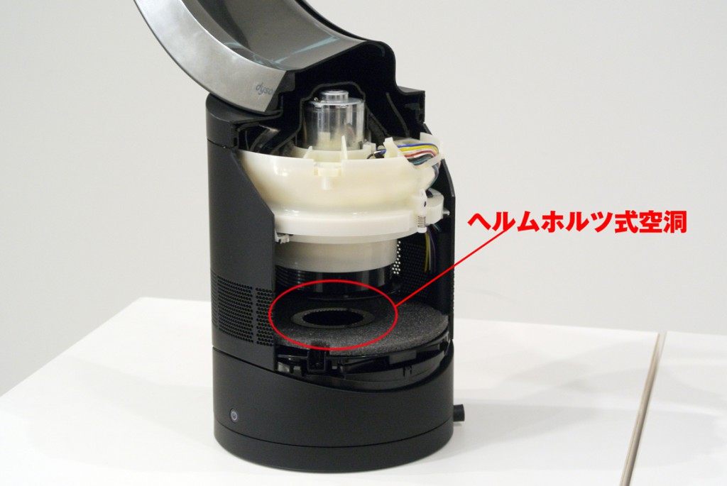 ヘルムホルツ式空洞とは、ヘルムホルツ共鳴を発生させる空洞で、音楽室や録音スタジオなどの壁面に空いた細かい穴、バスレフ型スピーカなどにも使われている原理。その仕組みを扇風機の消音機構に採用したという事なのだ。