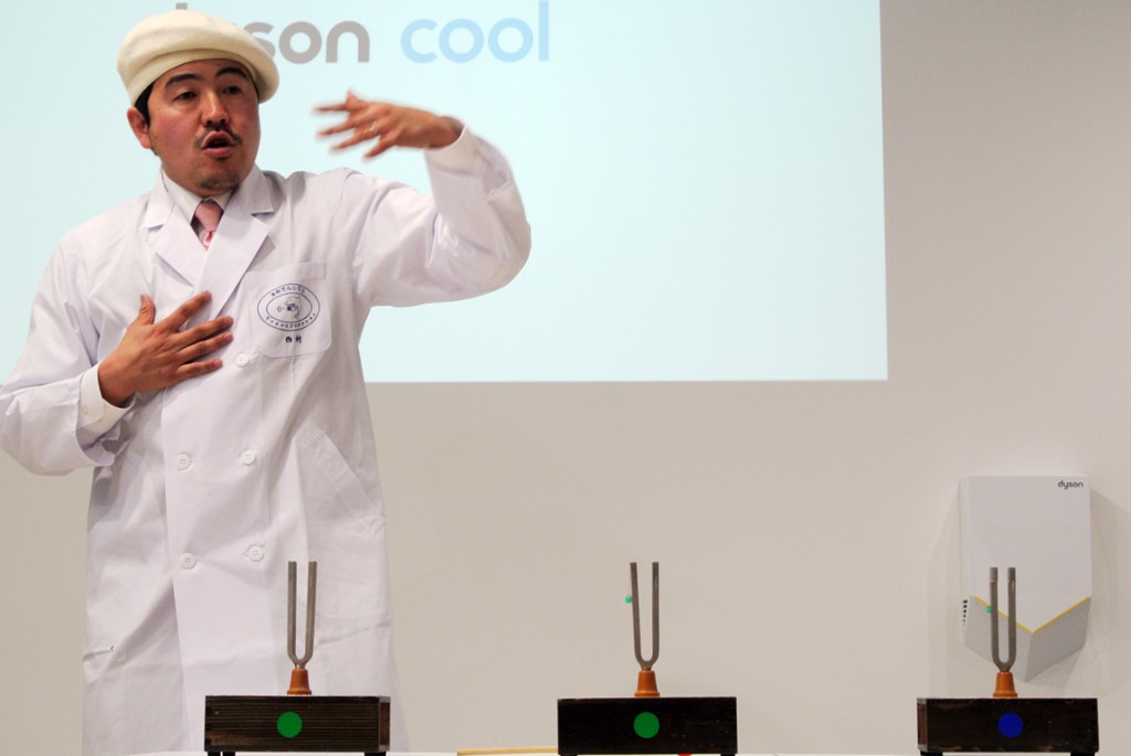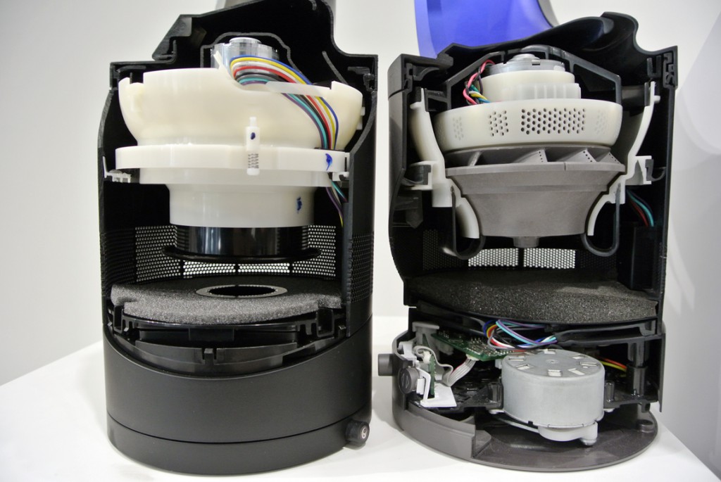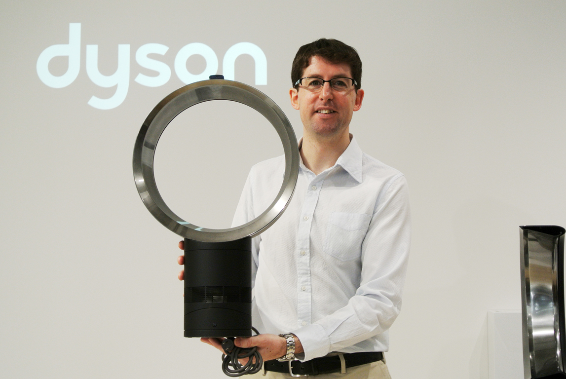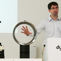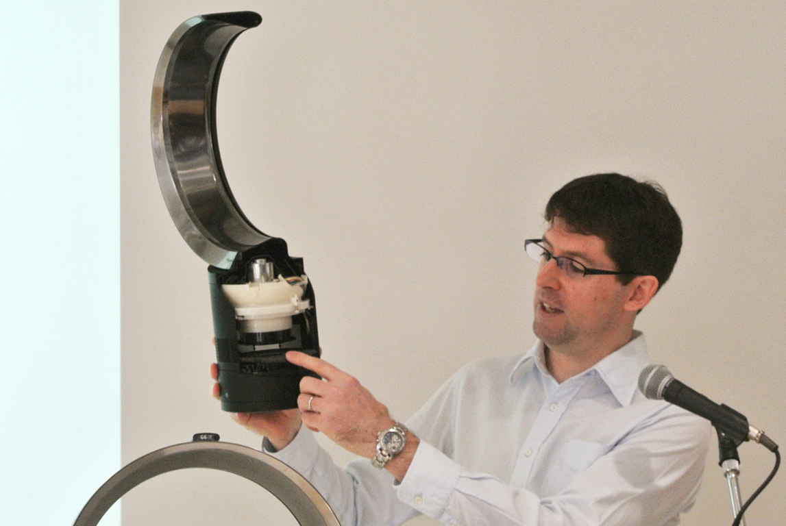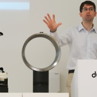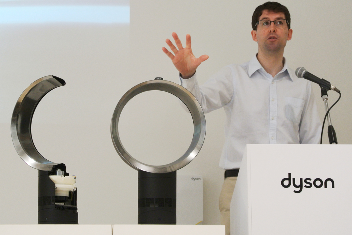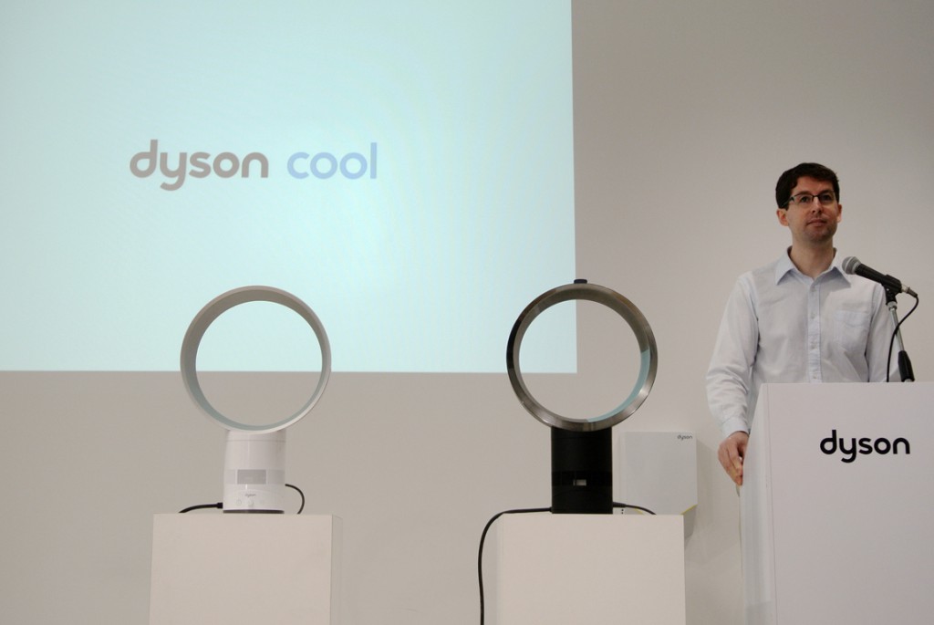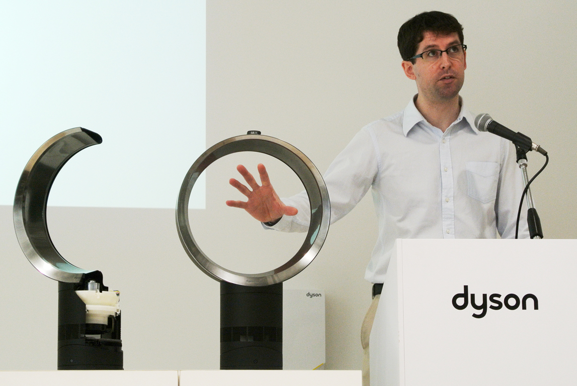ダイソンのシニアデザインエンジニアのマーティン・ピーク氏によって、ダイソンの羽無し扇風機の仕組みと、改良されたエアフローに関しての説明が行われた。ダイソンのファンは、通常の扇風機と比べ、本体下部にある送風機構より円形(楕円形)のフレームに風を送り、隙間から風を吹き出す事で空気の流れ(エアフロー)を生み出し、風を作っていた。風を生み出す羽(フレーム)を翼状にすることで、パワフルなエアフローを生み出しているが、動作音が大きいという問題があったとの事。