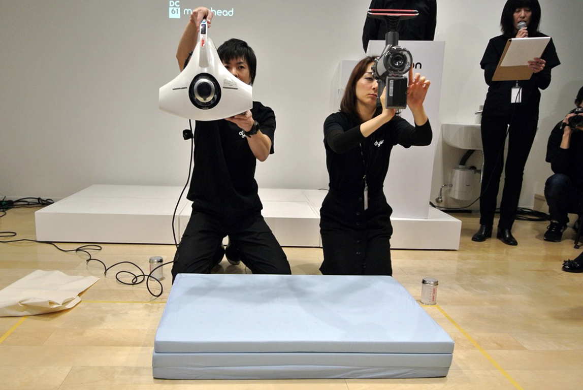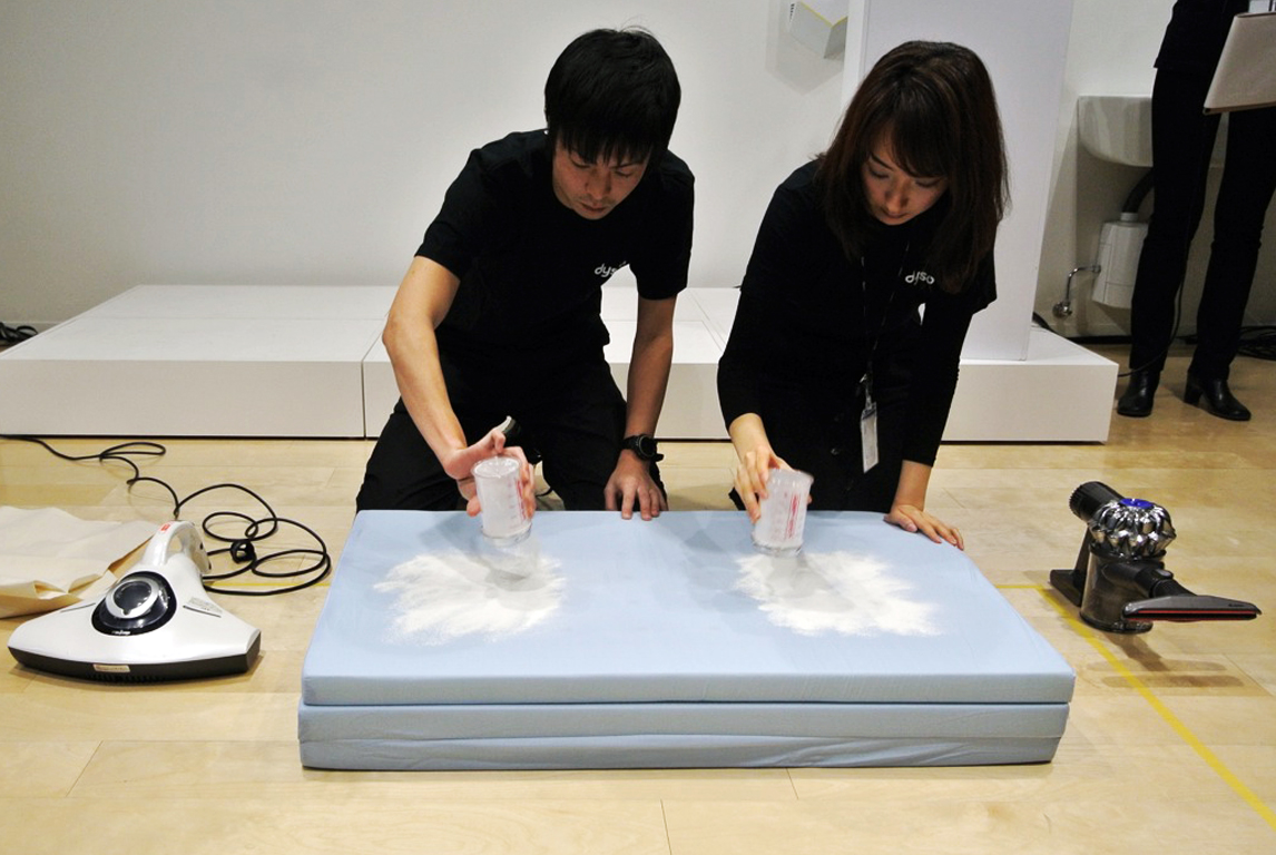 実験では、ハウスダストに見立てたベビーパウダーをマットレスに捲き、手で擦り込んだあと、その上からシーツを被せ、吸引するという方法をとった。これは、シーツの更に下にある敷き布団などに入り込んでいるハウスダストを吸引するという状況を再現している。比較対象の掃除機として、レイコップの布団掃除機「RS-300」を使用。ダイソン製の掃除機はハンディタイプの「DC61」を使用。レイコップは新品、満充電の状態、パワーモードで5往復を行い、ダイソンはある程度の­使用状態、満充電、ノーマルモードで3往復。
