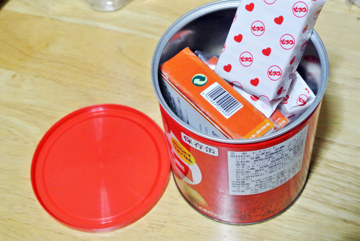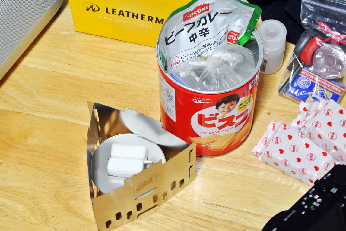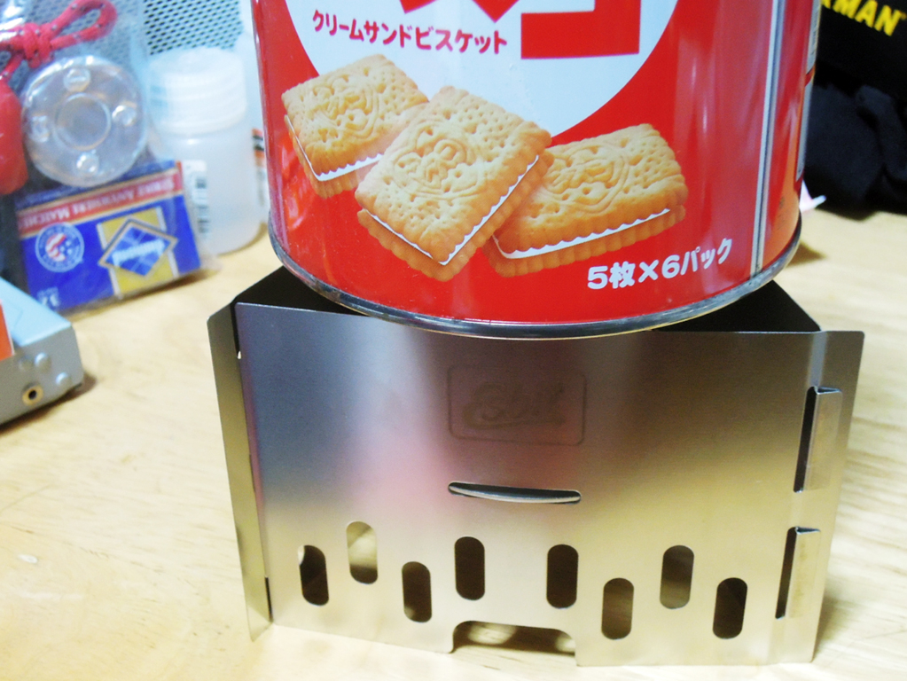 エスビットストーブのセット、予備の固形燃料、マッチなどの着火用具、残りの包みなどは缶の中に再び収納する事が可能。