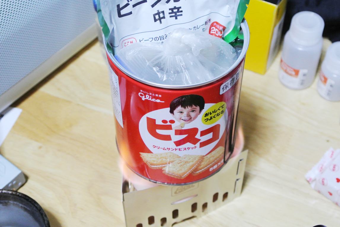 災害時を想定し、災害初日に缶入りの保存食を食べた後、次の食事の際、空き缶を利用してビニール袋炊飯をするという想定で実際に試してみた。今回は、固形燃料(エスビット)を使用。