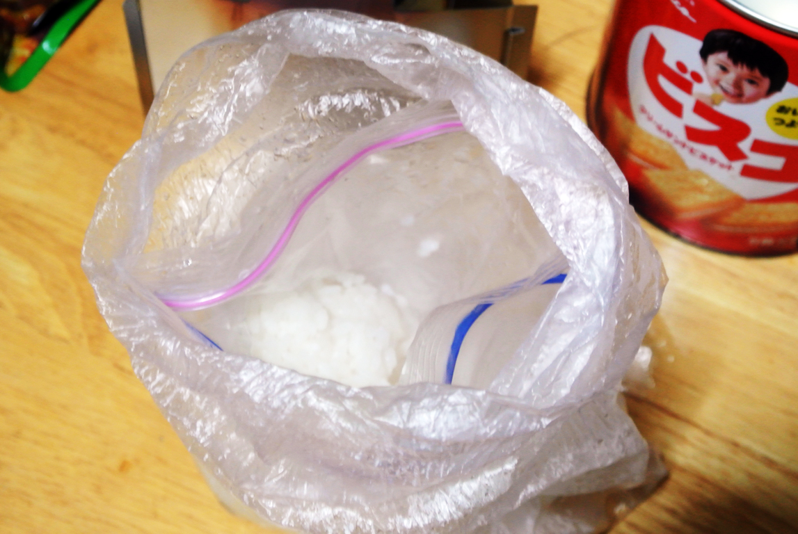 ビスコ缶は、一般的なクッカーと比較して金属容器が薄いのとクッカーとして専用設計ではないと言う事もあり、ビニール袋が一部熱で溶けて炊飯の汁が煮汁に染み出る事になった。底に接触しないようにうまく配置を工夫するなどすれば良かった。