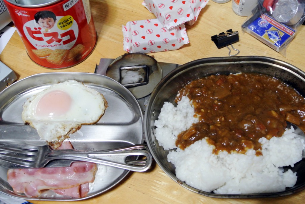 今回の想定は、災害発生初日に、すぐ食べられるビスコ缶を開けて、その次の食事に冷蔵庫に入っている足の速い食品を副食として調理して食べてしまうという事で、卵とベーコンをプライパンで焼いておかずとした。