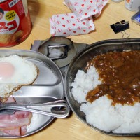 ベーコンを焼いた後の脂で卵を焼き、盛りつけた後のフライパンにご飯をあけてレトルトカレーをかけた。