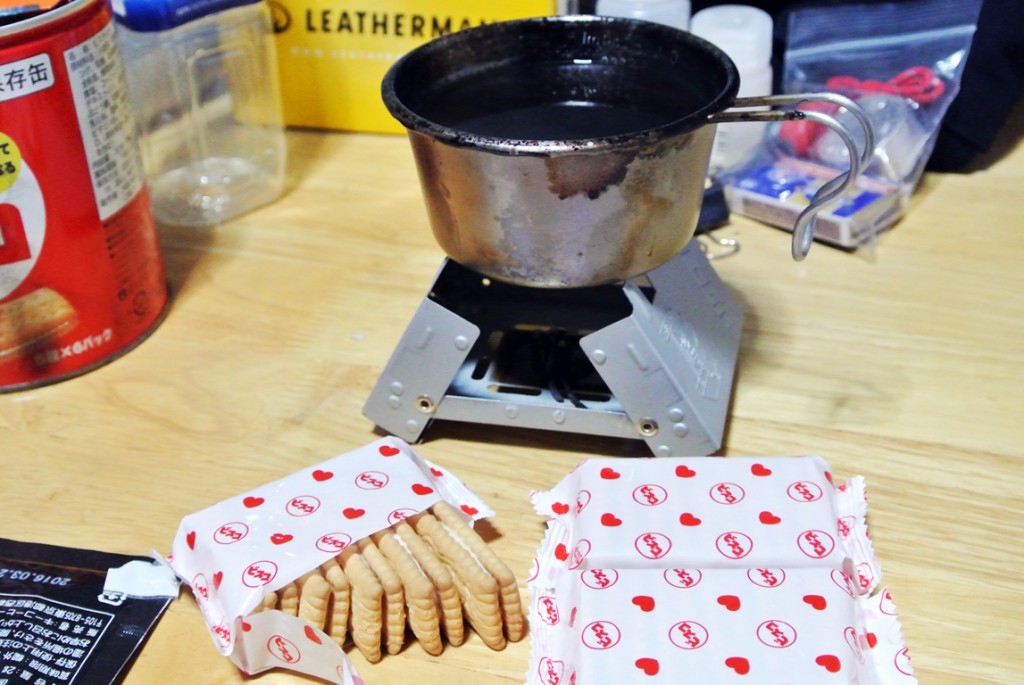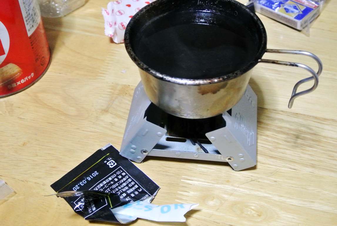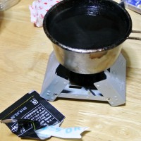 また、4つのタブレットで約15分燃焼。沸騰してから10分程度加熱したが、どうやら加熱時間が足りなかったようだ。燃料を増やすか、燃料が尽きてもしばらく放置して余熱で調理する、もう少し長く水に浸しておく、などを行えば良かったかもしれない。芯が残って固い状態で食すより、少し柔らかめに炊きあがる状態の方が非常時には良いかと思う。