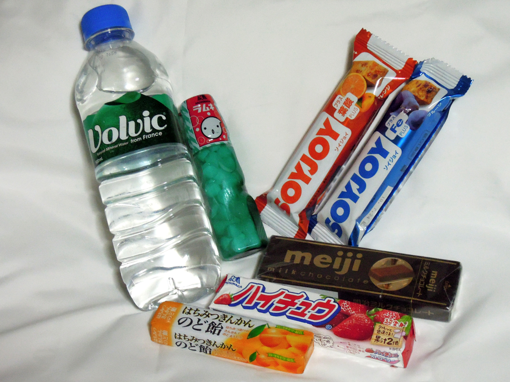 その他、栄養補助食品的なシリアルバー、エネルギーバーやチョコレート、キャンディなどは夏は暑さで溶けたり、カバンの中で折れたり割れたりする事もあったり、賞味期限がそれほど長くないなど欠点もありますが、ローリングストックとして、常に新しい物を買い足して古い物から食べてゆくとよいでしょう。最近では、防災用途も見越して、賞味期限が長い物もあるので、それらを選ぶのも良いでしょう。手軽に買えるものとしては、ボトル入りのラムネは、食べるとすぐにエネルギーになる上に、長期保存向いています。