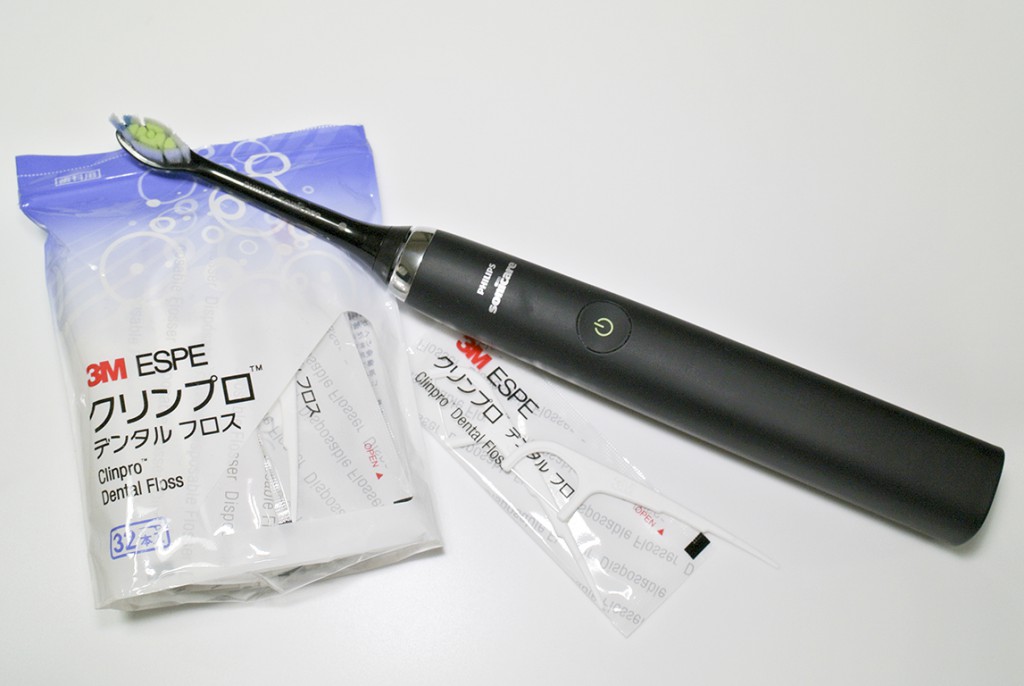 そんな「ソニッケアー ダイヤモンドクリーン(トラベルケース付)」すが、いくら電動歯ブラシでも歯茎の奥などブラシが届かない場所、磨きにくい場所やしつこい汚れなどもあります。ですので、1週間に1度くらいの割合でデンタルフロスを併用して歯茎の奥の汚れや歯の間の汚れを取るようにしています。「3M クリンプロ デンタル フロス」は、フロスが切れにくく、個別包装で衛生的なので、旅行先に必要分持って行ったり、防災用のバッグなどに複数個入れておいて災害時のケアに役立てたりと活用しています。