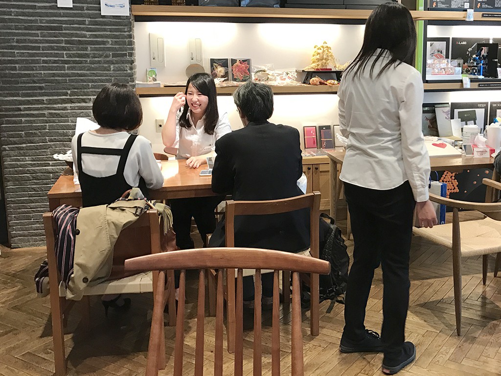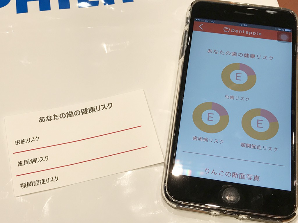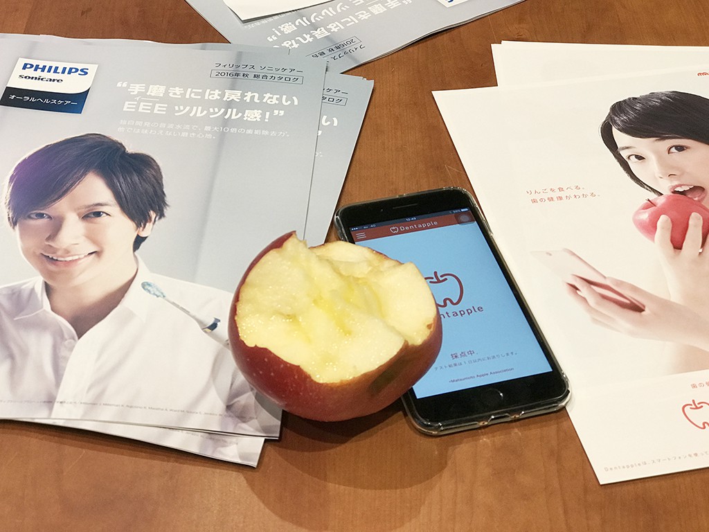 長野県のアンテナショップ銀座NAGANOで行われた「お口の健康診断」イベントでは、長野県産のリンゴ「ふじ」を齧ることで、その齧った様子やアンケートを歯科衛生士が解析して口腔ケアのアドバイスをしてくれるアプリ「デンタプル(Dentapple)」を用いて診断をしてもらいました。
