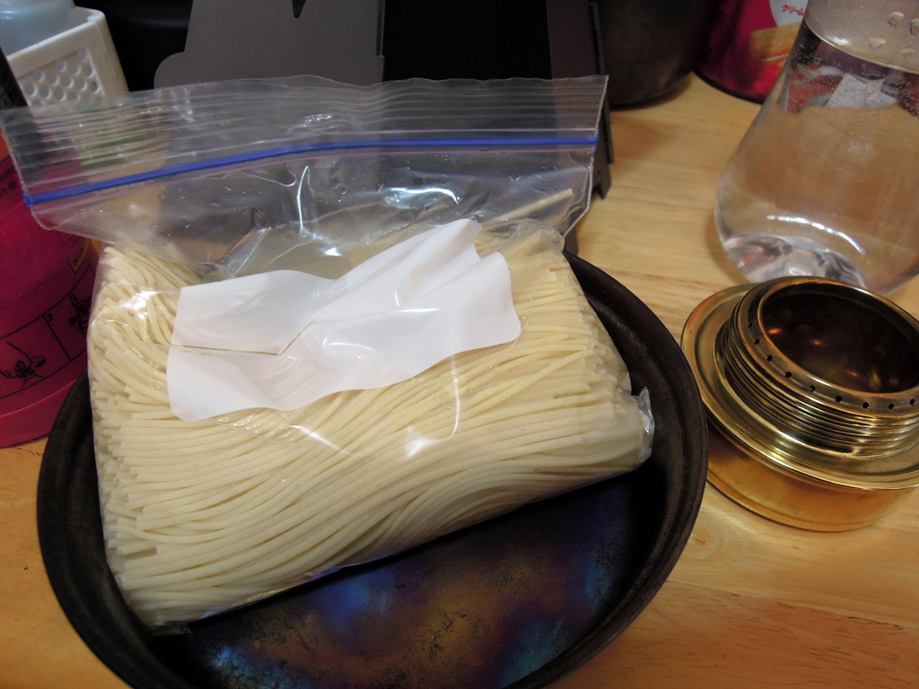 チャック付きの冷凍バッグに半分に折ったパスタと水を入れ、30分〜1時間程度浸しておく。程度の問題もあるが、原則的にはいくら浸しておいても問題は無い。