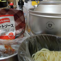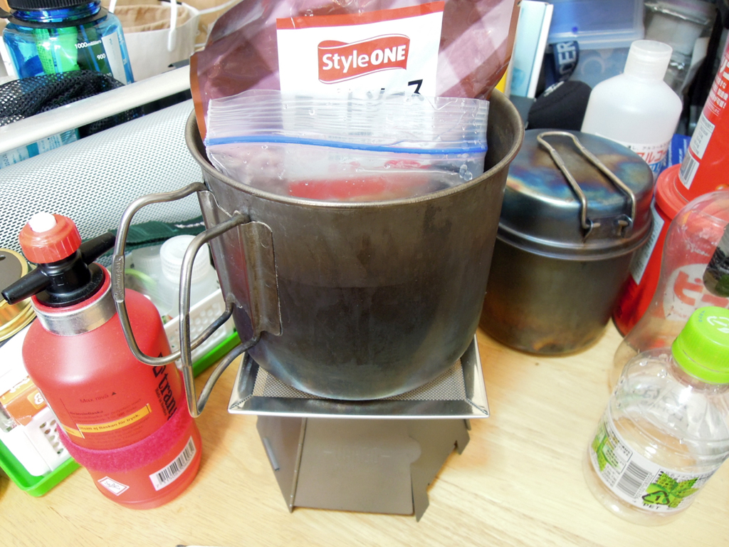 袋全体が浸る程度の鍋にレトルトのソースと一緒に入れて茹でる。沸騰状態になって2〜3分程度茹でるだけなので、通常時の半分〜1/3程度の時間で茹でることができる(その分の燃料も節約できる)。