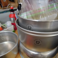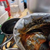 こちらは別の鍋で茹でた時の様子。湯で時間が足りないと、食感が若干粉っぽくなるので、しっかり茹でよう。ビニール袋を2重にしたり、茹でる時に袋の位置をずらす等して袋が溶けない様注意したい。ゆであがったら、ビニール袋に穴をあければザルの代わりになって、お湯を切る事ができる。