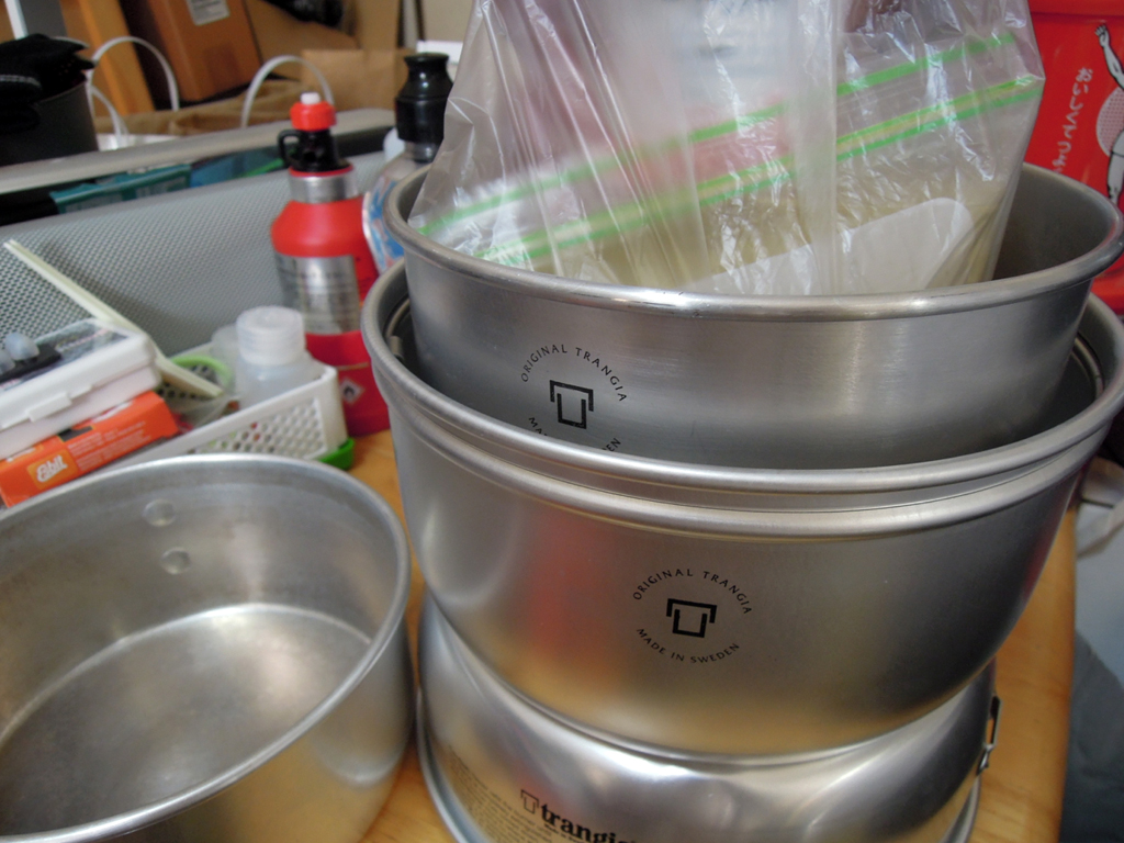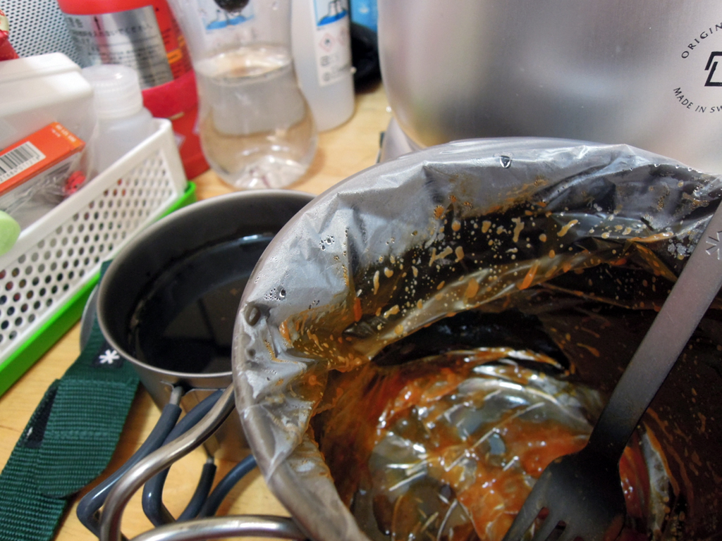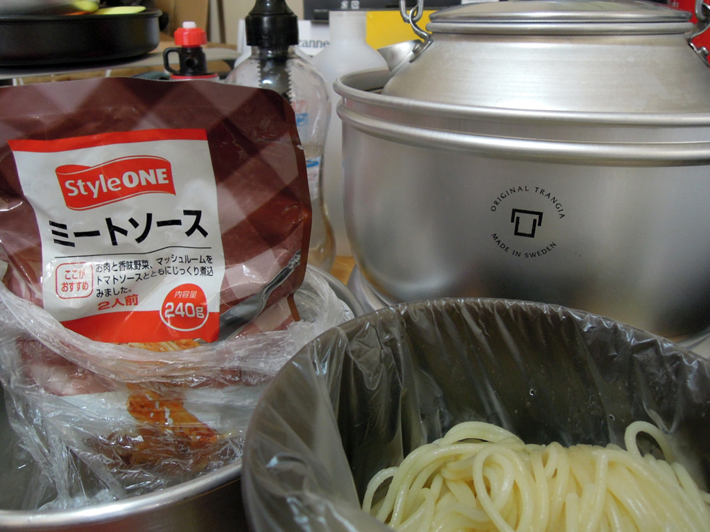 非常時には、パスタソースのような油分が多く、粘性の高い液体の汚れを落とすのが大変だ。ビニール袋を器に被せる事で、片付けが容易になる。食べ終わったら、袋を外して、その袋の中にレトルトパックの袋やその他のゴミを入れてしまえば良い。
