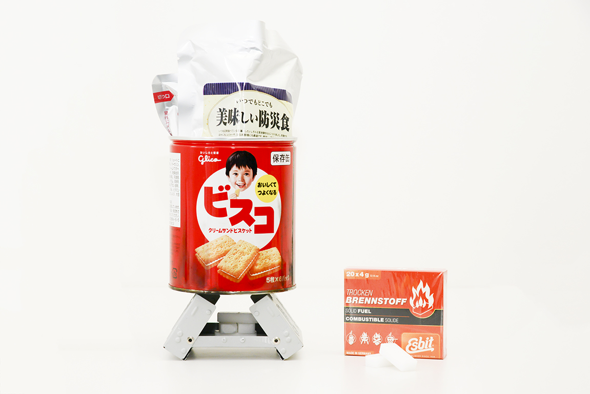 一番手軽なのは、固形燃料だろう。有名なのはエスビットと呼ばれる折りたたみのストーブと固形燃料のセットだ。最近では、ミリタリータブレット(1個づつ個別包装された燃料)も発売されており、長期保存も格段にやりやすくなっている。メーカーが謳っているスペックではレギュラータブレット(4g)2個で250ccの水を5分で沸かせるという事だ。コンパクトで取り扱いも容易なので、避難バッグに一つ放り込んでおけばいざという時に役に立つ。発災直後に、缶入りビスコなど調理不要の非常食を食べて、落ち着いたら空き缶でお湯を沸かしてレトルト食品やアルファ米、フリーズドライ食品を調理して食べるなどのシナリオで3日分くらいを準備しておきたい。