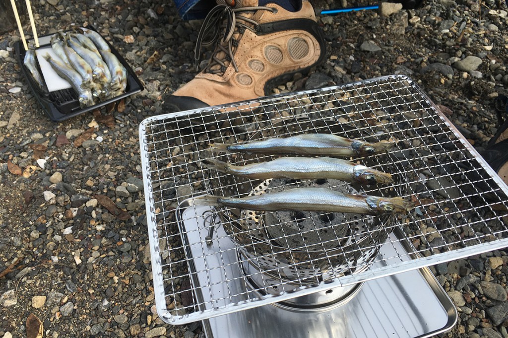 家庭用の調理器具を利用してコンロを作る事もできる。これは蒸し器を利用したたき火台(炭火コンロ)で、例ではヤシガラ炭を使用してししゃもを焼いている。まきをくべて暖をとったり、網をのせて調理に使用したりと工夫次第でいろいろできる。