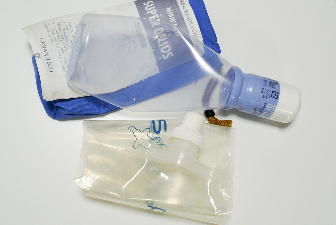避難(脱出)などで移動がメインの持ち出し袋(帰宅支援バッグや非常持ち出し袋)には、規定量の飲料水とバックアップとして「アーバンテック スーパー デリオス」や「カタダイン ミニ