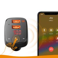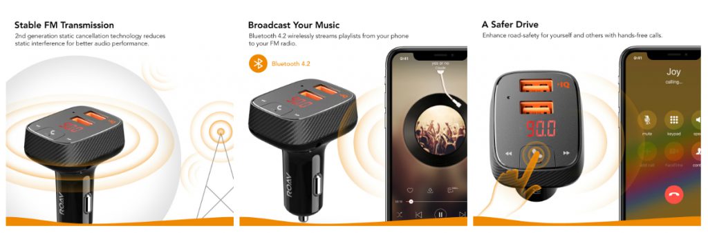 – 簡単セットアップ:車のプラグに差し込み、ラジオと本製品の FM 周波数(78 – 90 MHz)を合わせるだけ。