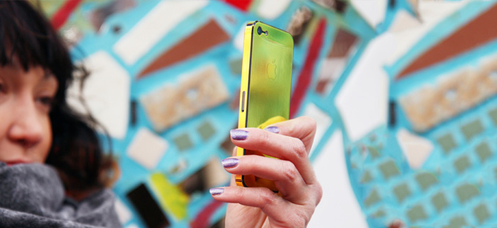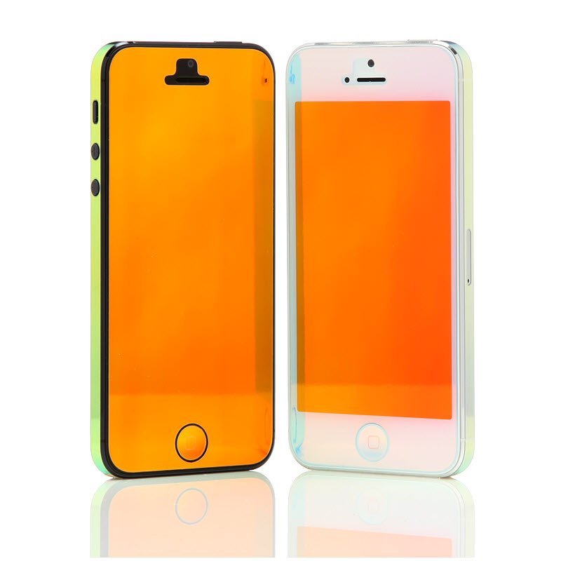 見る角度によって黄金色、エメラルドグリーン、オーシャンブルーなど、玉虫色に変化するiPhone用オーロラフィルムです。